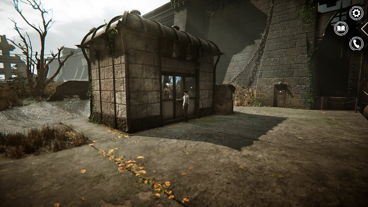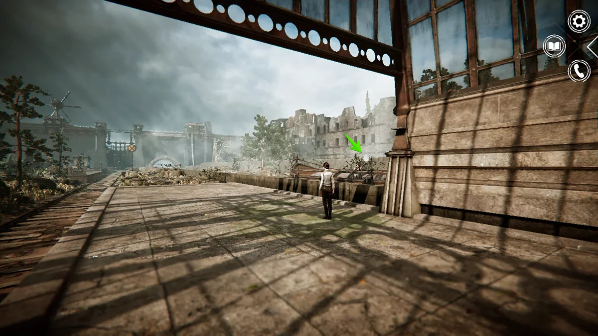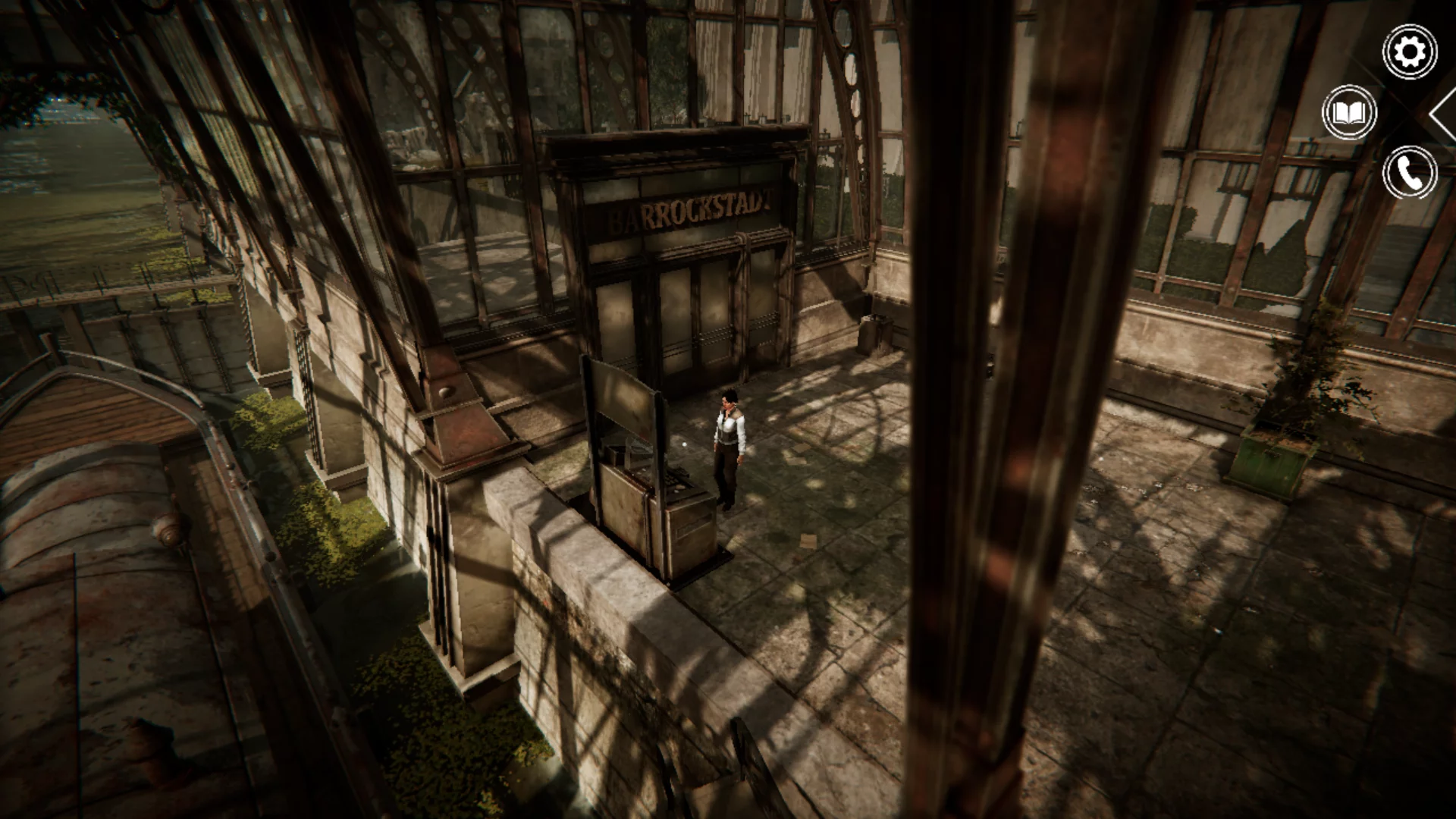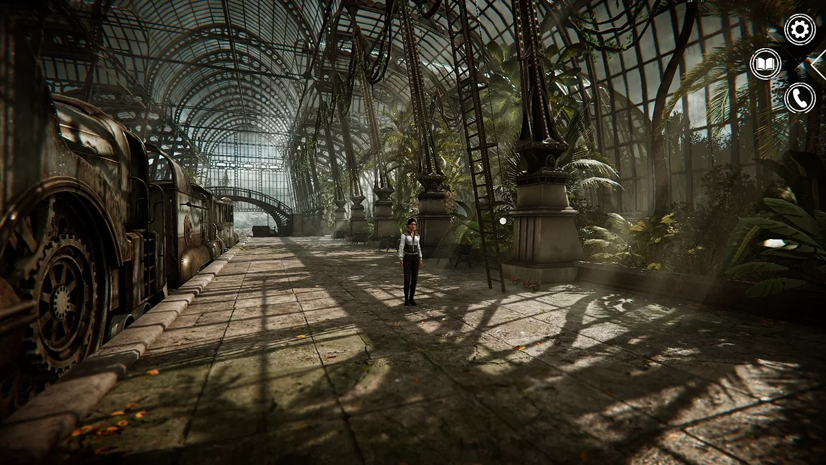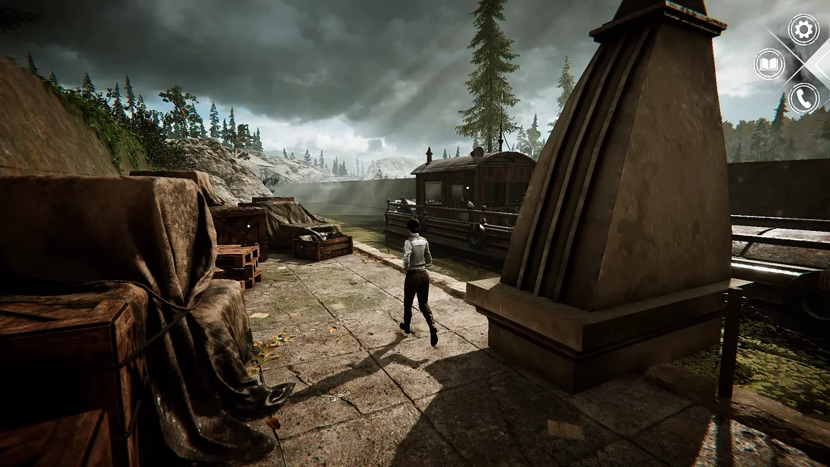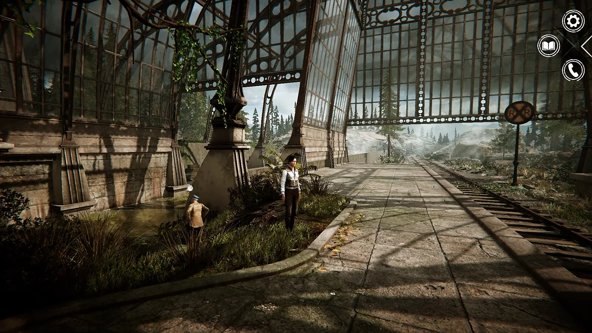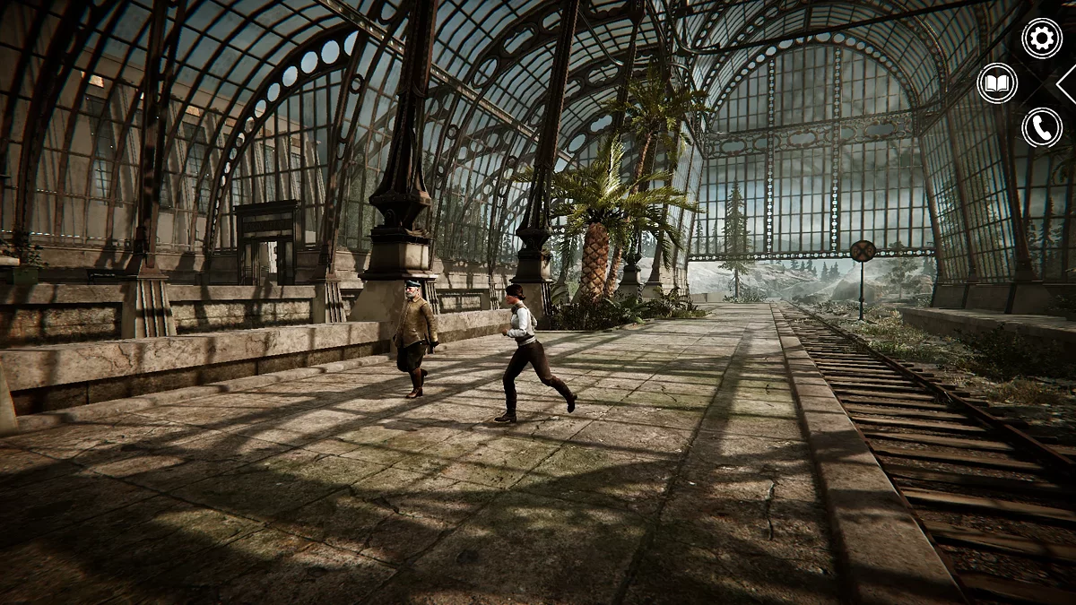 Возвращаемся к поезду и проходим на другую сторону, чтобы взаимодействовать с механизмом и завести пружины. Теперь обращаемся к Оскару и проезжаем ещё немного вперед до стены. Выходим из поезда, спускаемся справа и подходим к киоску, где снова ждет автоматон. Следовать далее он окажется, пока вы не предъявите ему выездную визу.