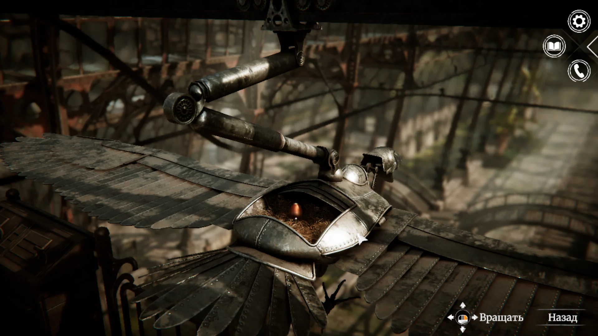 После того как птицы улетят, поднимитесь по лестнице и осмотрите механического орла. Внутри находится яйцо, необходимое для активации механического оркестра. Чтобы достать его, используйте щипцы, которые можно было найти в лаборатории профессора.