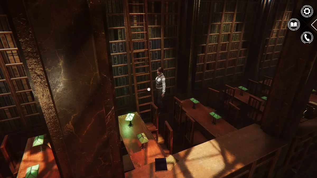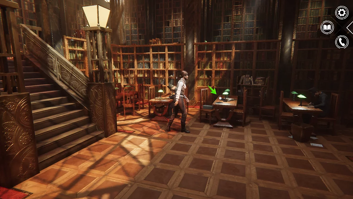 Покиньте кабинет ректоров и откройте похожую дверь справа — она ведёт в библиотеку. Спуститесь по лестнице и, не отвлекая студентов, подберите книгу и элемент оркестра №2, лежащие за пустым столом.