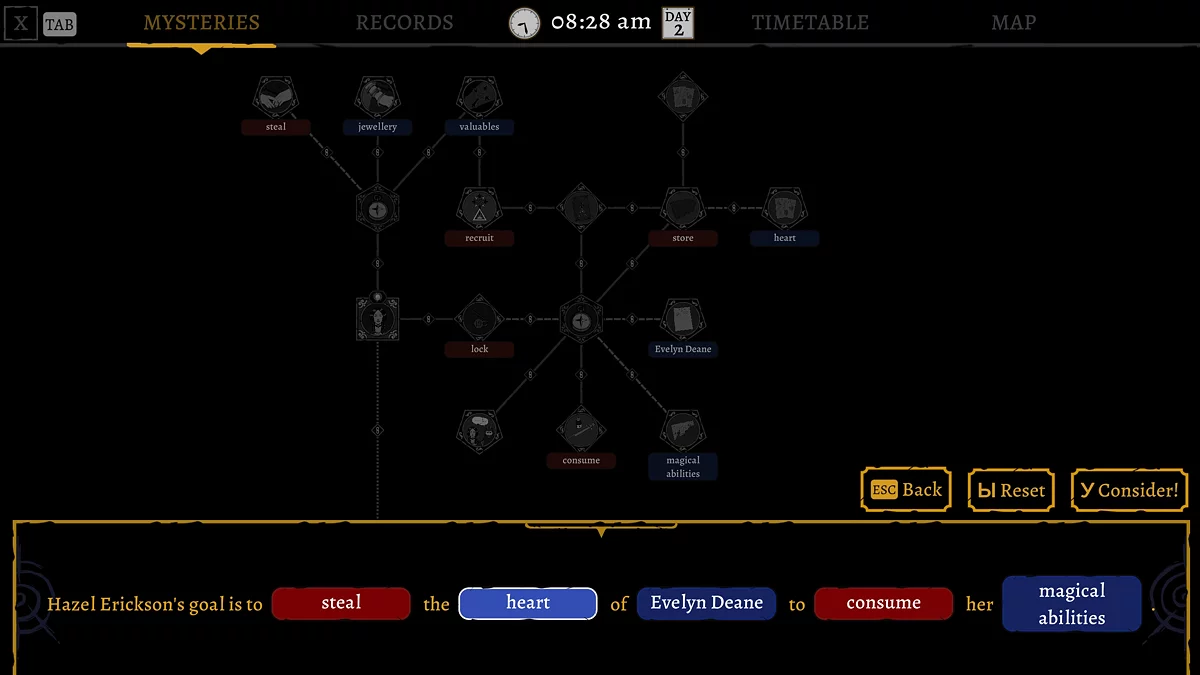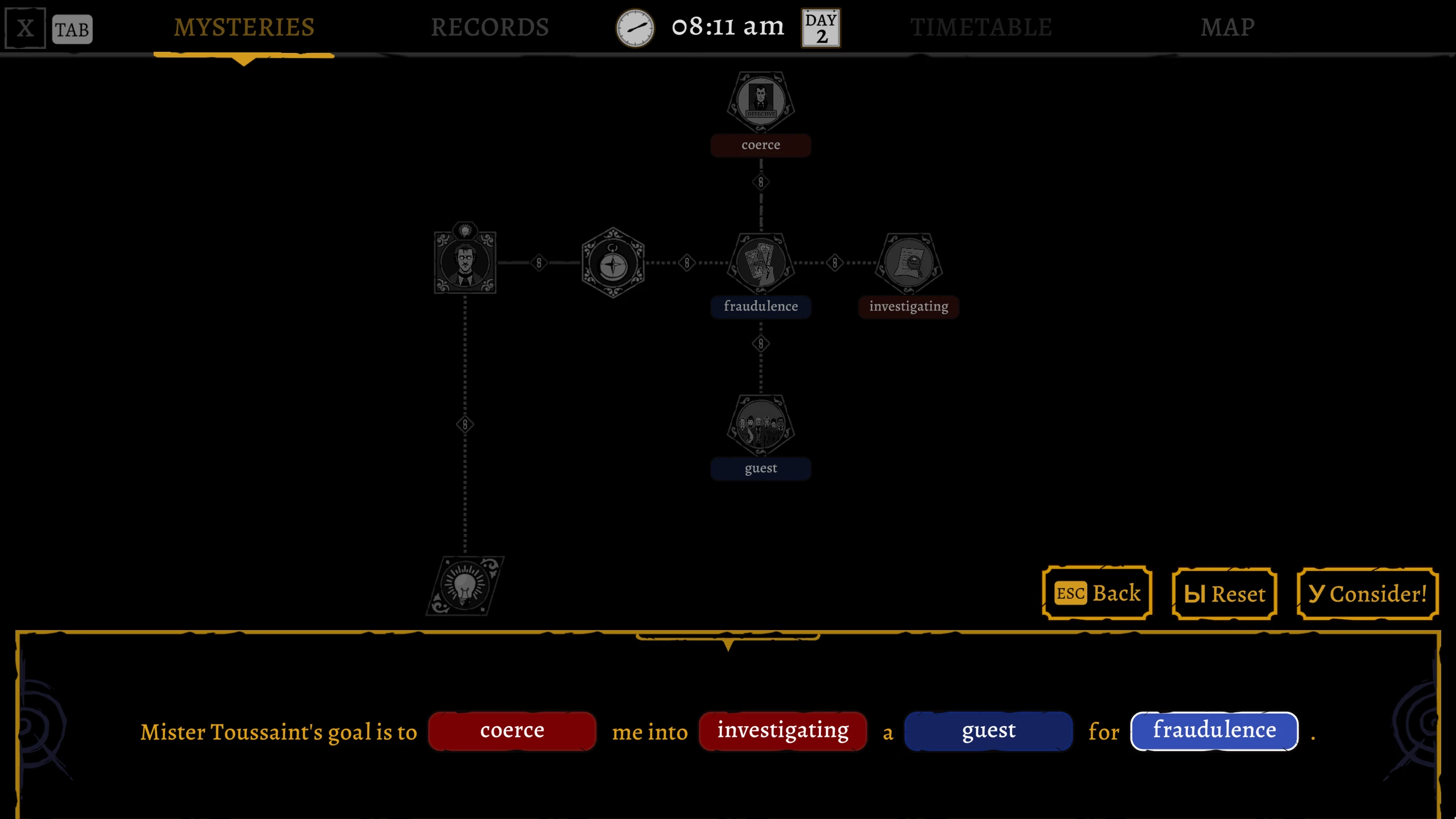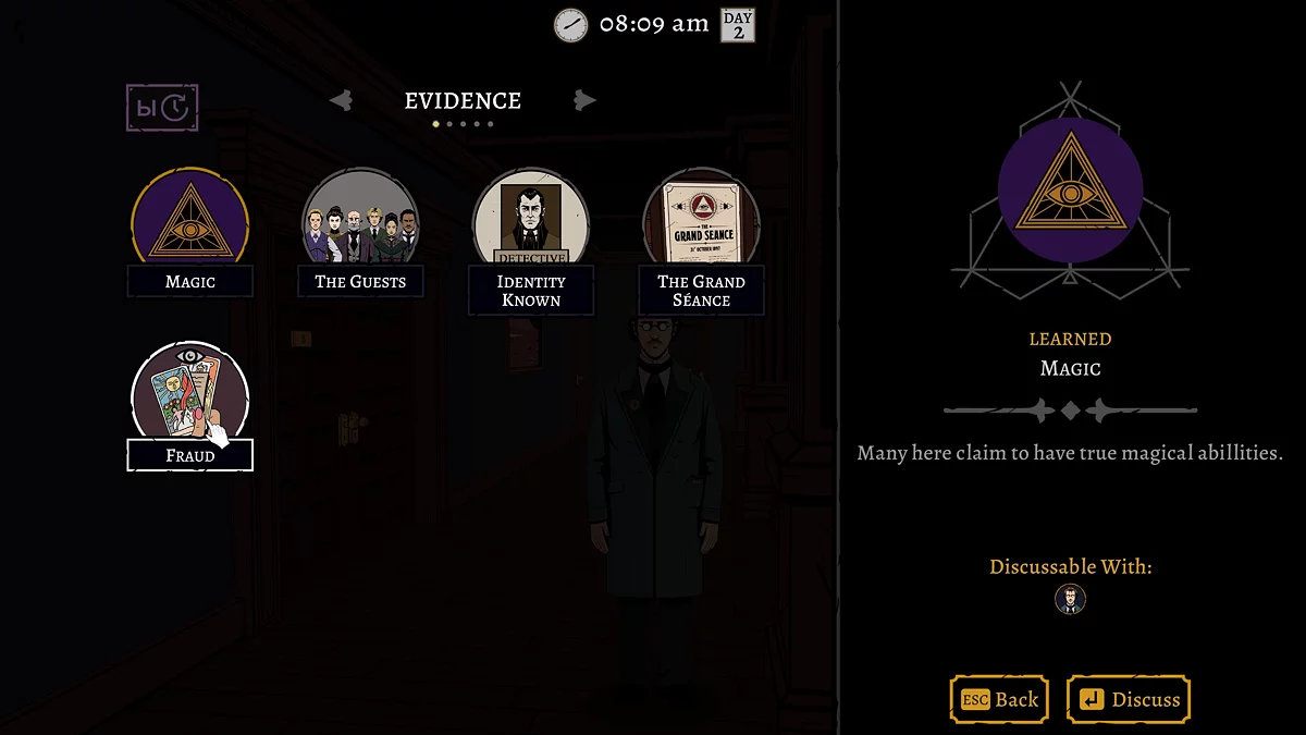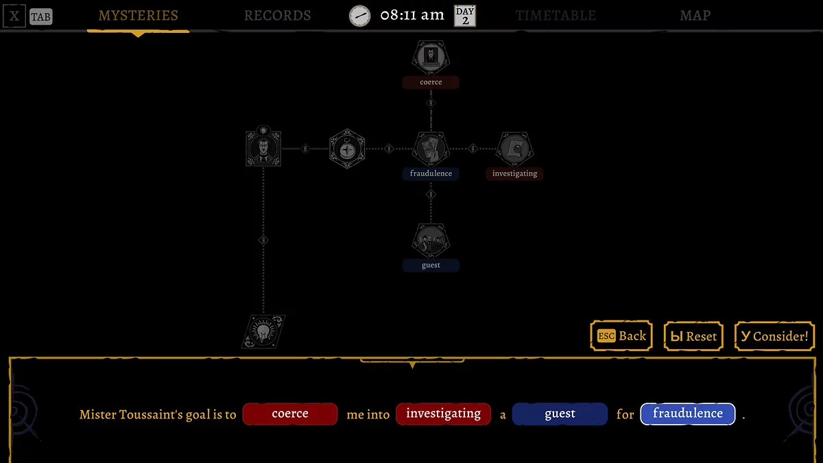 Он предлагает нам сделку: если мы согласимся кое-что сделать для него, он не раскроет личность главного героя за общим завтраком. Чтобы понять мотивы следователя, допрашиваем его и выбираем улики «Мошенник», а затем «Гости». После этого формируем гипотезу, с помощью которой можно будет узнать суть сделки.