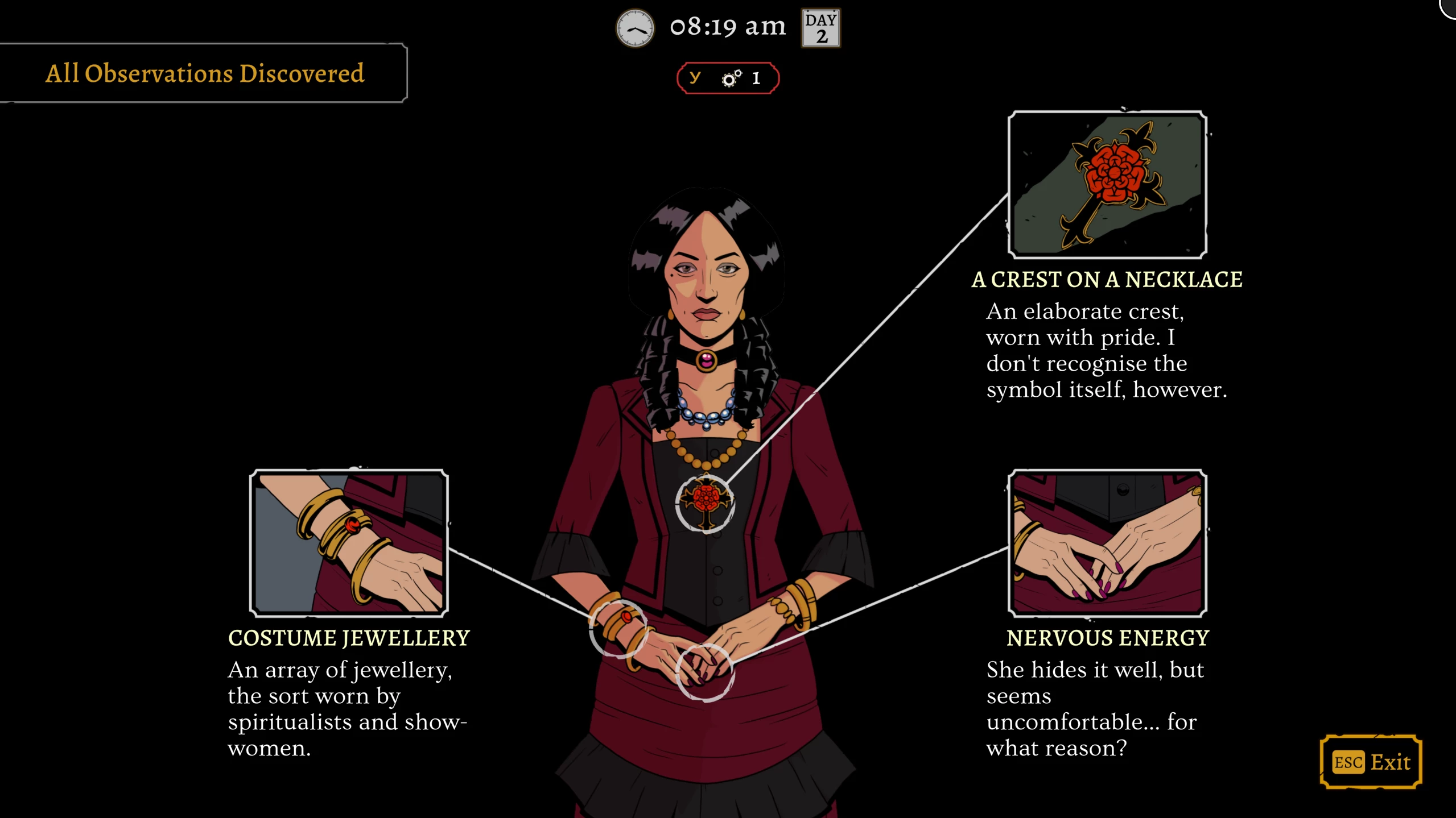 С полученными уликами спускаемся на первый этаж к мадам Эриксон и расспрашиваем ее о найденных предметах. Также анализируем саму персону с помощью специальной опции.