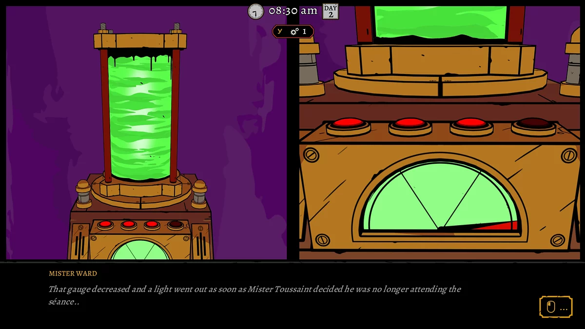 После изучения того, что на самом деле замышляла женщина, следователь в спешке покидает сеанс, что приводит к изменению странного устройства на первом этаже: его энергия понижается.