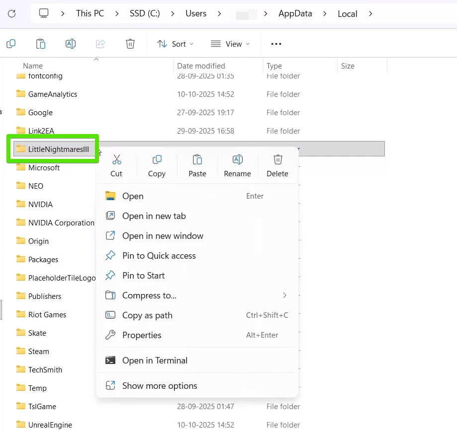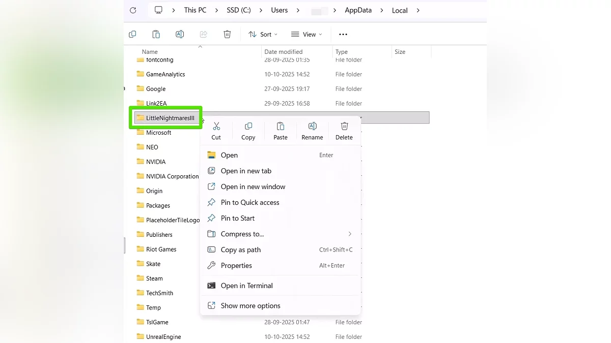 - Перейдите по пути C:\Users\имя_пользователя\AppData\Local\LittleNightmares3
