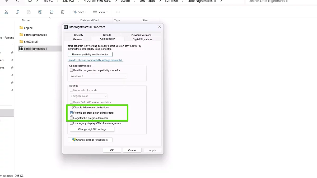 - При необходимости также отметьте «Отключить полноэкранные оптимизации».