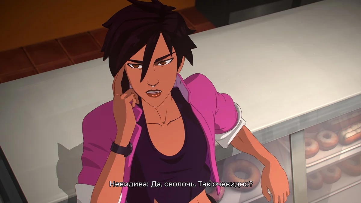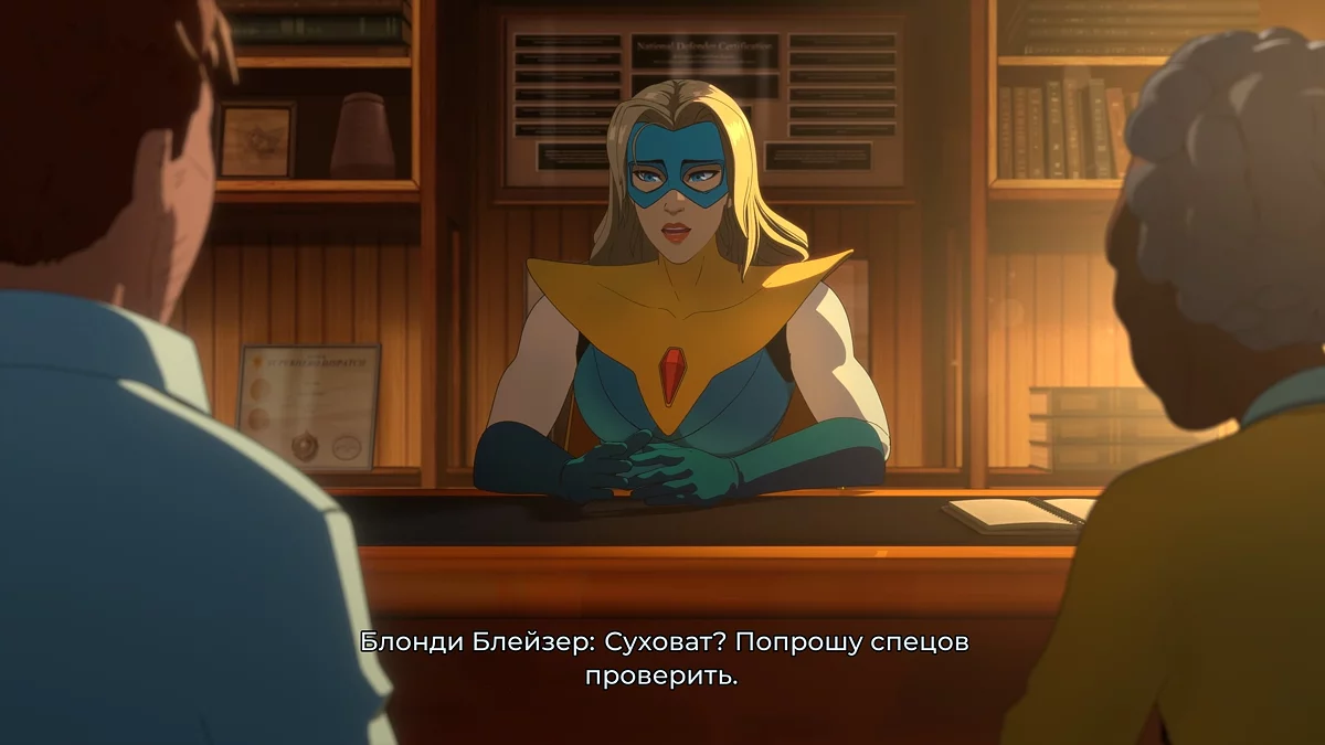 - Эпизод №3 «Текучка»: Разговор с Блондой (Blonde Blazer) о Невидиве (Invisigal) в конце смены.