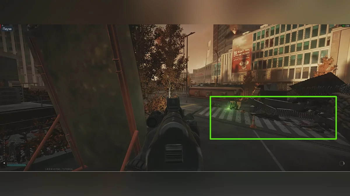 Выходите с парковки, прямо перед выходом также будут трупы с лутом. Немного левее на дороге появятся враги. Следуйте по дороге или по левой стороне — если перейти дорогу и попытаться пройти рядом с небольшой будкой, нарветесь на мину.