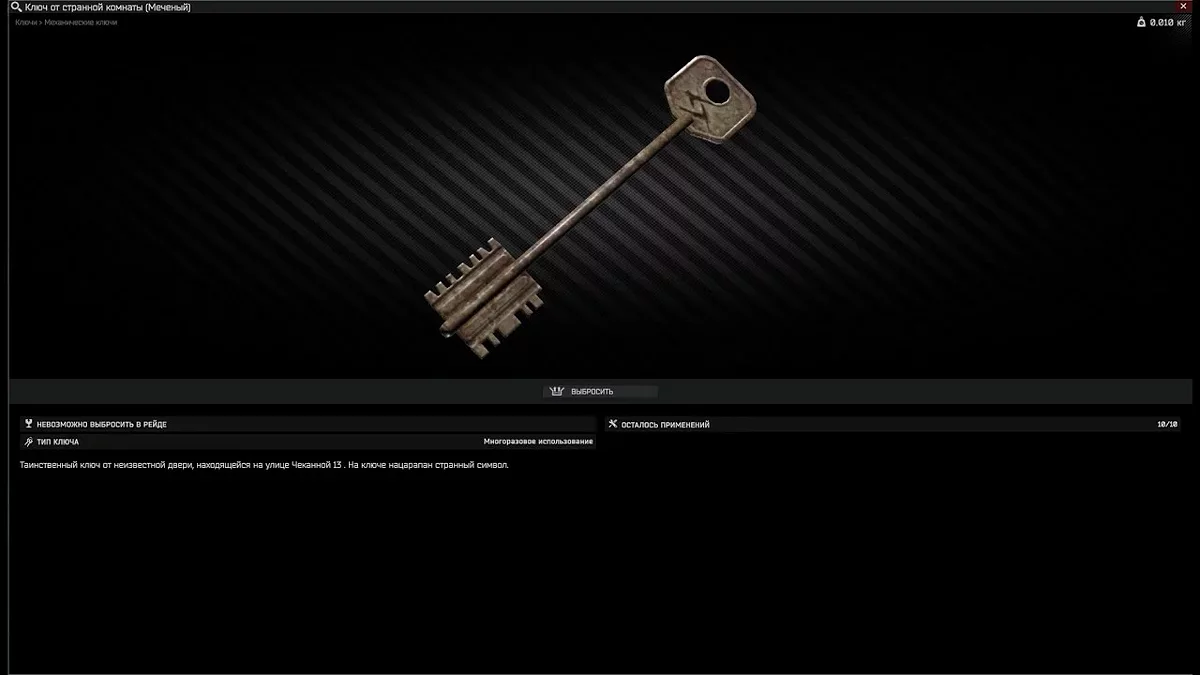 Когда ключ окажется у вас, возвращаемся в дом, открываем меченую комнату и подбираем обломок. На этом этапе важно вынести предмет из рейда — только тогда квест будет засчитан. После успешного выхода возвращаемся к Механику и передаём ему находку.
