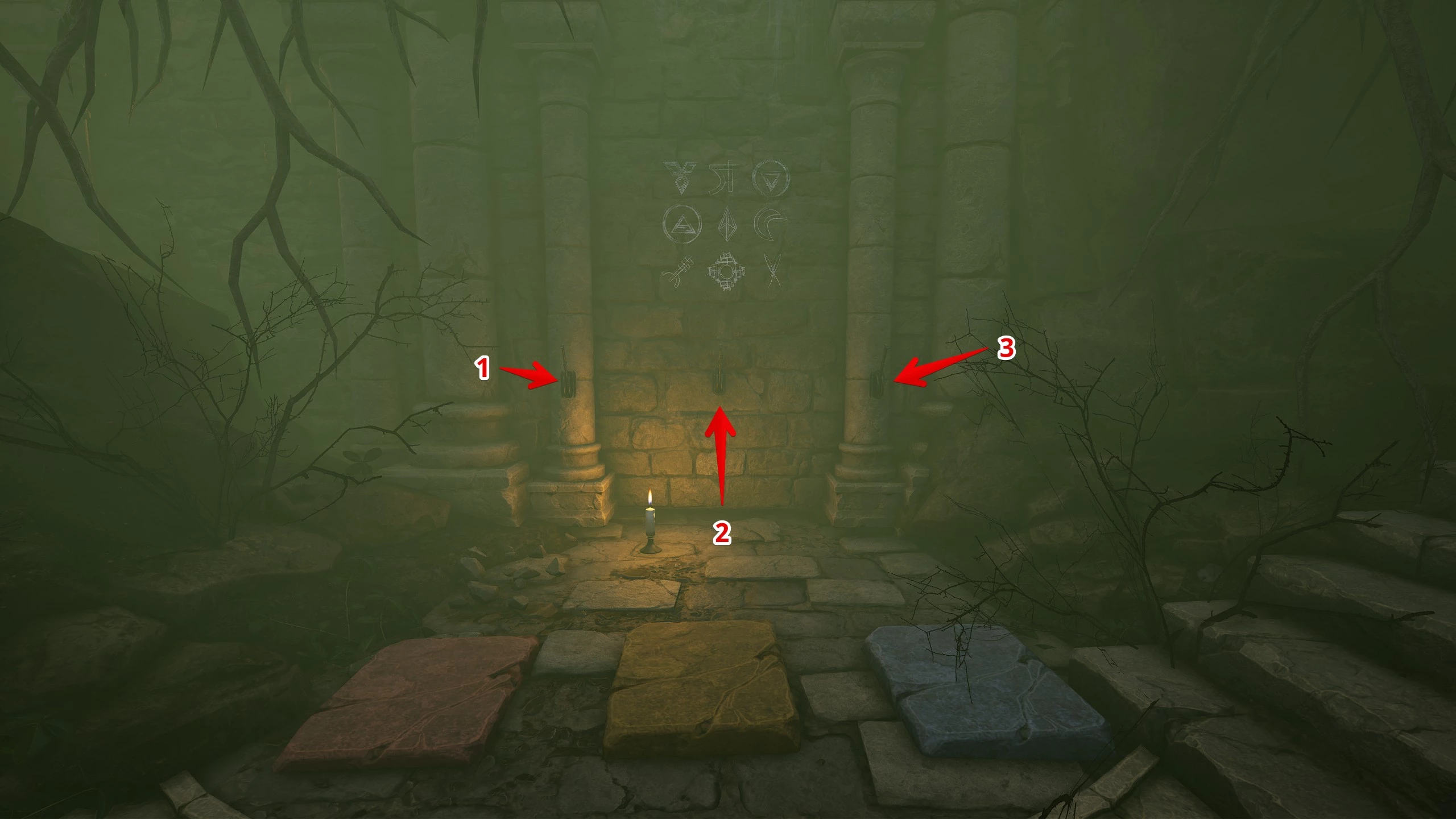 Напротив двери к древней книге есть решётка. Чтобы её открыть, нужно решить головоломку в начале пещеры. На полу есть плитки: красная, жёлтая и синяя, а на стене три рычага. Задача в правильной последовательности нажать пластину и опустить ручку.