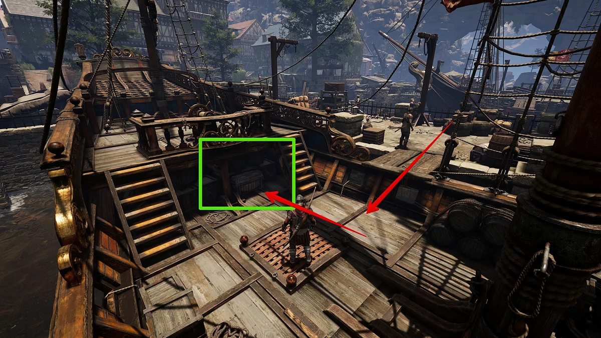 Вернитесь к охраннику и пройдите проверку на убеждения, используя 40-й уровень «Проницательности», или деритесь. Любым способом окажетесь на палубе, сверните направо и откройте сундук, чтобы взять фрагмент карты. Тут есть баг, при котором Тристан застревает в текстурах. Присядьте и отойдите в сторону мачты.