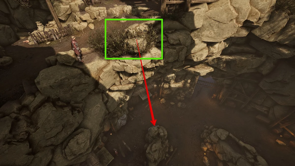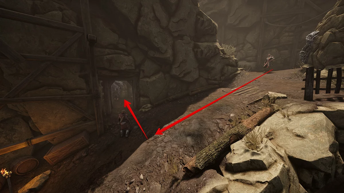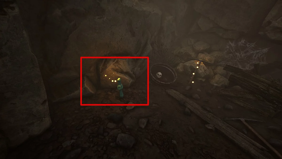 Войдите в штольню и перебейте жуков, а затем соберите все зелёные вытянутые грибы. Кроме того, советуем подобрать кирку Торста и сходить в северо-восточную часть шахты. Там расположены жилы кристаллической руды, а также связка оружия. Кстати, рядом со грудой клинков есть золотая руда, и ещё, если посмотреть наверх, можно увидеть бревно, ведущее в закуток с сокровищами. Последний гриб растёт за камнем справа от пруда с заразным кристаллом.