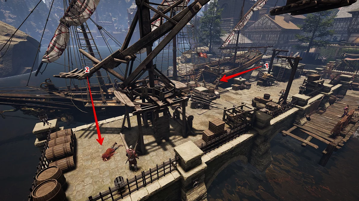 Отправляйтесь в Пригород. Подойдите к доске с заданиями и отыщите перед переходом в Лагерь Лесорубов дом слева. Поговорите с Ламбертом (Limbert), отойдите с ним в сторону и проговорите все варианты диалога. Затем убейте его, подберите и прочитайте портовую записку.