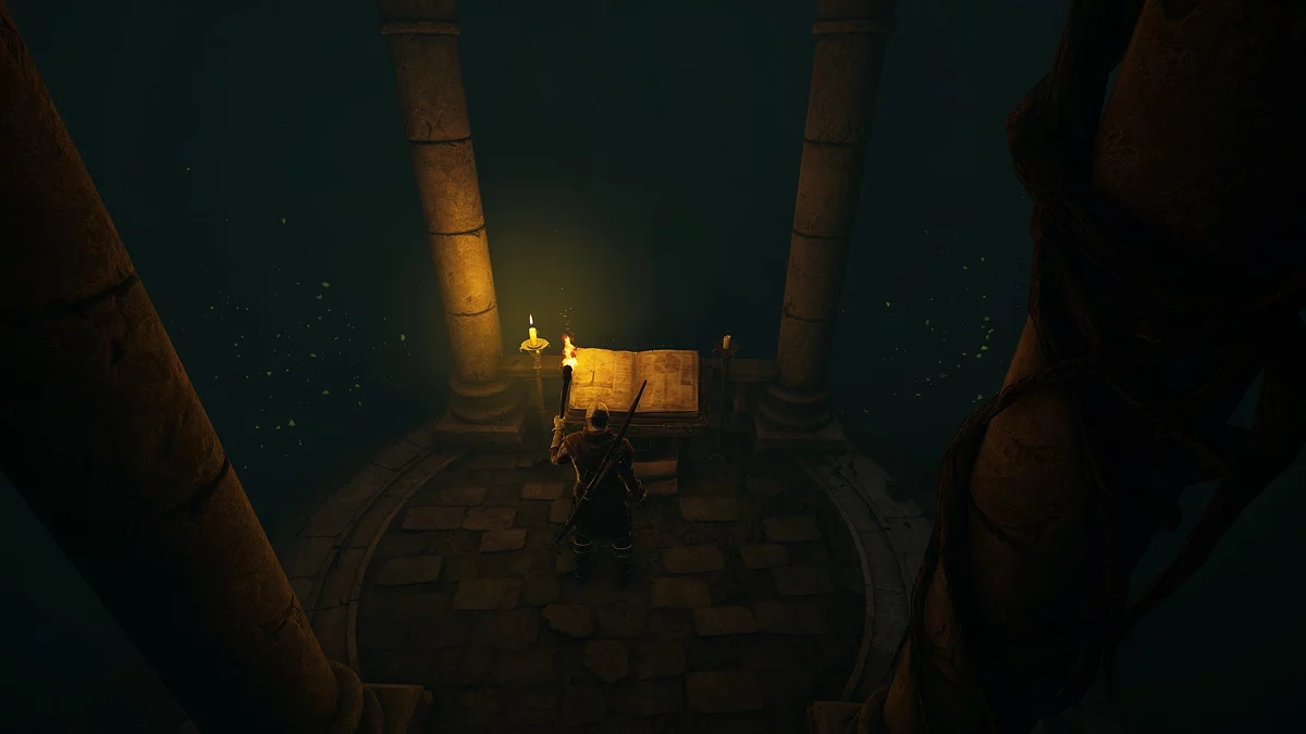 Пройдите через решётку, перебейте всех, кого встретите. Подберите с тела Кормака (Kormak) записку «Шифр Древних» и ключ Кормака. Откройте в конце калитку, убейте двух сильных пепельных стража, вооружённых рапирой. Прочитайте книгу, благодаря которой герой теперь может освоить древние знания. Первый навык — «Язык Дектата», позволяющий читать фолианты и камни Древних, один такой будет в руинах с проклятыми мародёрами перед этой пещерой.