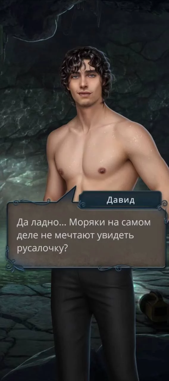 Помощник капитана перестал реагировать на окружающий мир. Не меняя позы, он смотрел перед собой и, кажется, перестал даже моргать. Давид пошутил, что моряки должны мечтать увидеть русалочку, но Одри ответила, что мечтать и увидеть — очень разные вещи. Помощник не смог бы плыть, потому что не мог даже закрыть рот и вытереть слюну. Давид решил плыть без него, чтобы капитан сам забрал его позже. Одри была категорически против. Фелония решила, что проще забрать с собой мужчину, чем уговорить Одри оставить его в пещере. Она взяла помощника за шкирку, словно котенка, подтащила к берегу и нырнула. Давид обратился к Одри, сказал, что сейчас ее очередь. Взглянув на воду, девушка вдруг ощутила, что ей тоже страшно.