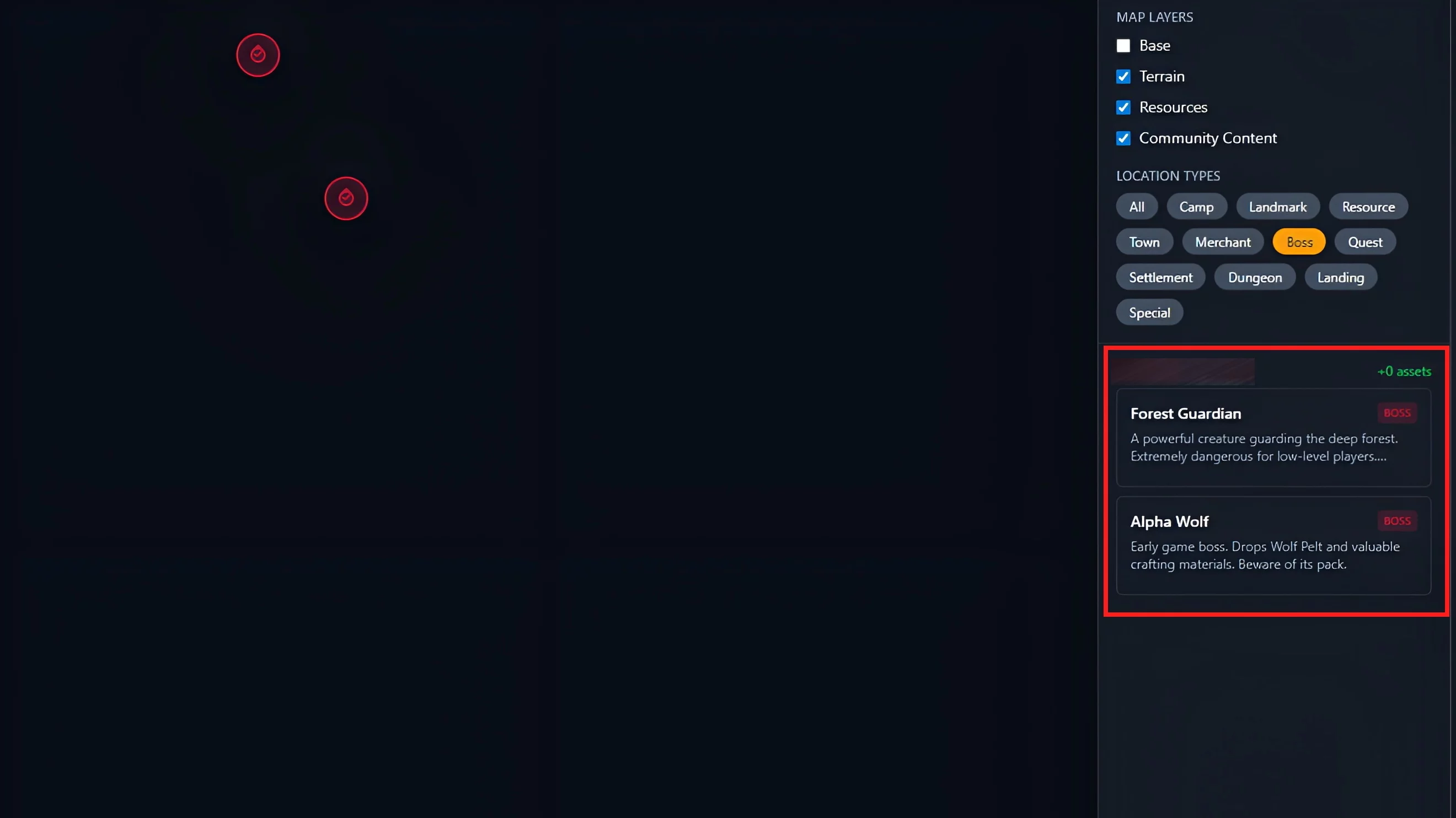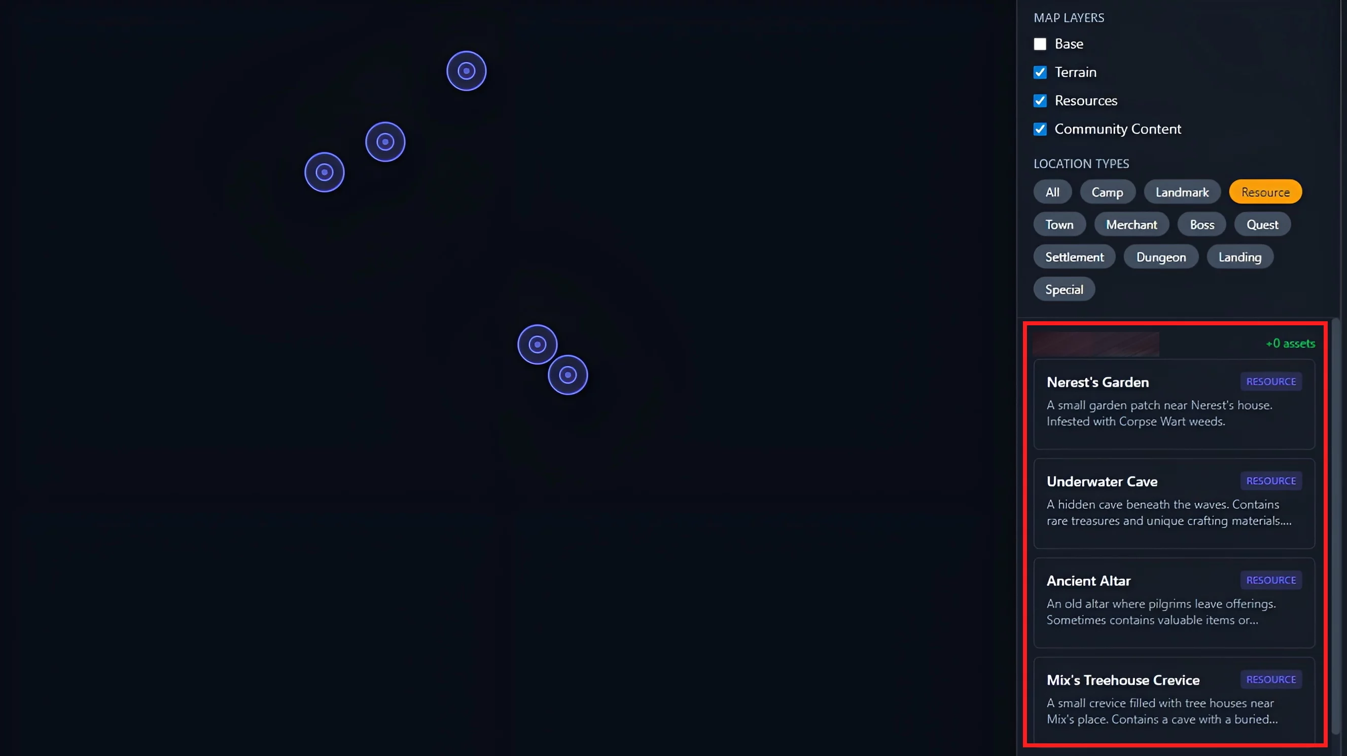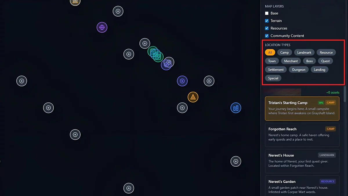 Виды локаций (Location Types). Тут вы решаете, какие объекты вас интересуют. Если иконка горит, то она отображается на карте, если нет — то вы её не видите. Полный список: