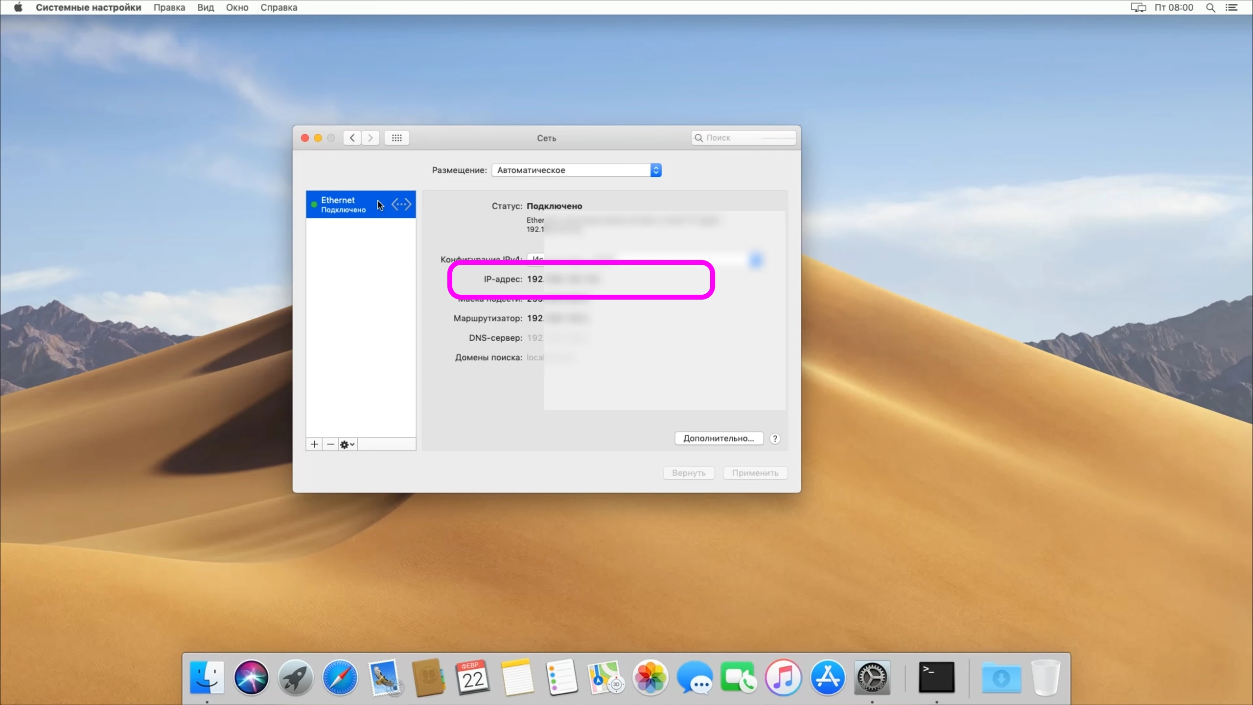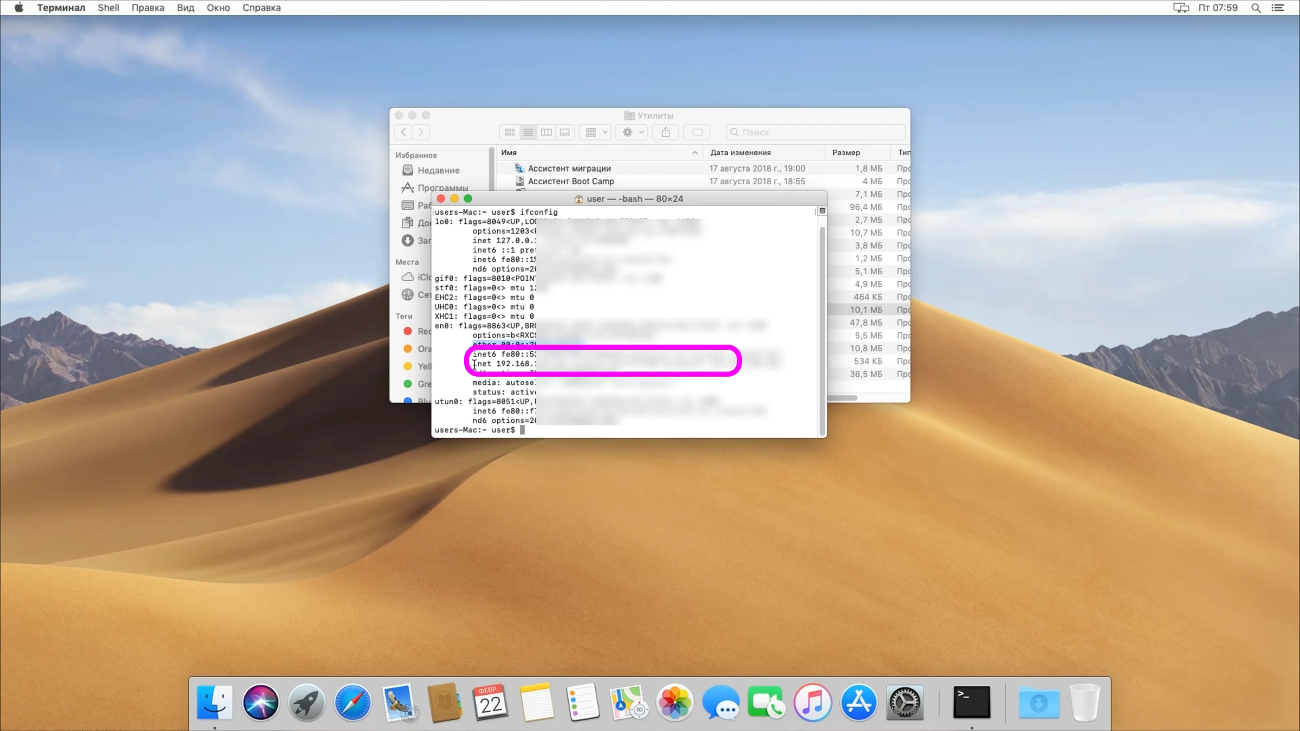 Запустите терминал устройства через Finder или иными способами, а затем введите команду «ifconfig». Необходимый идентификатор будет находиться напротив строки «inet».