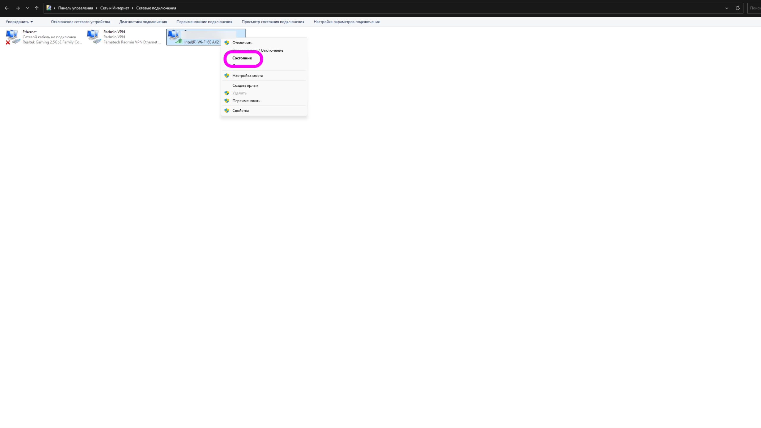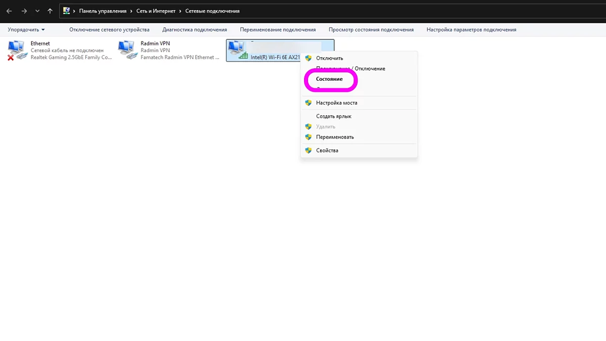 Ищем в поиске «Просмотр сетевых подключений» и нажимаем правой кнопкой мыши по нужному адаптеру.