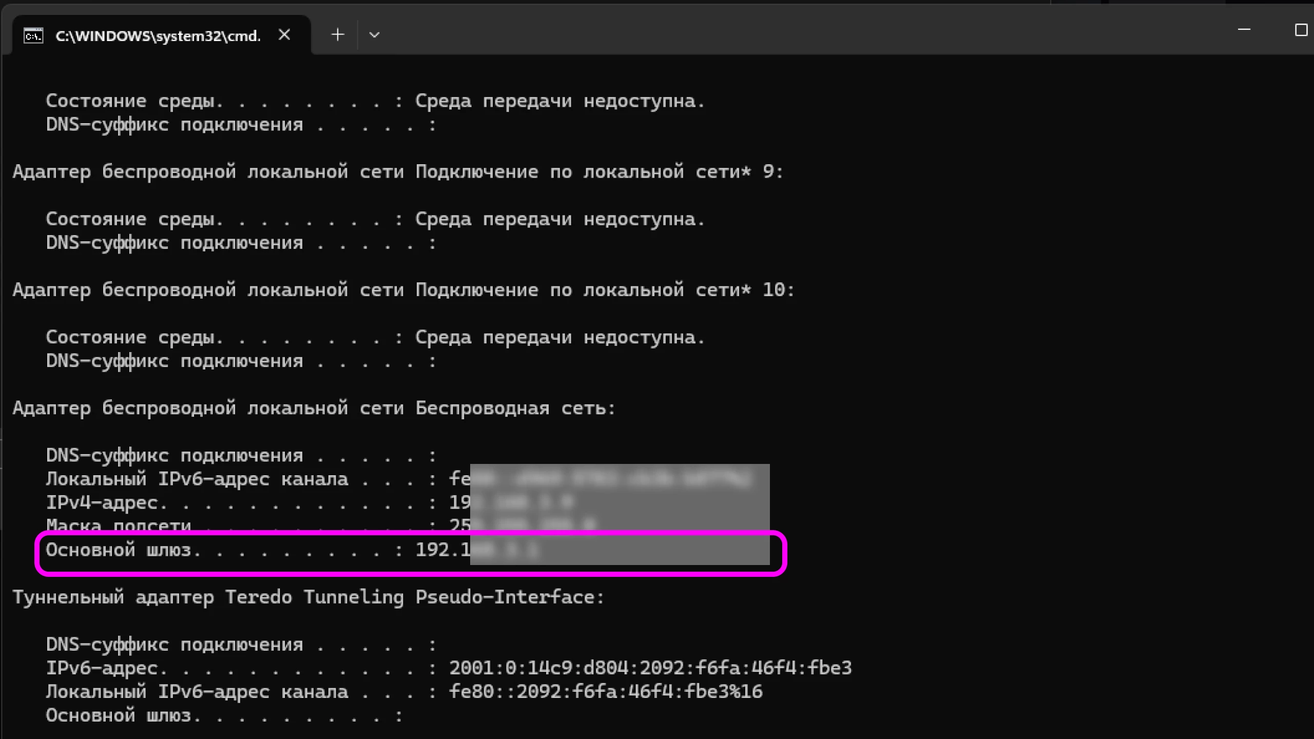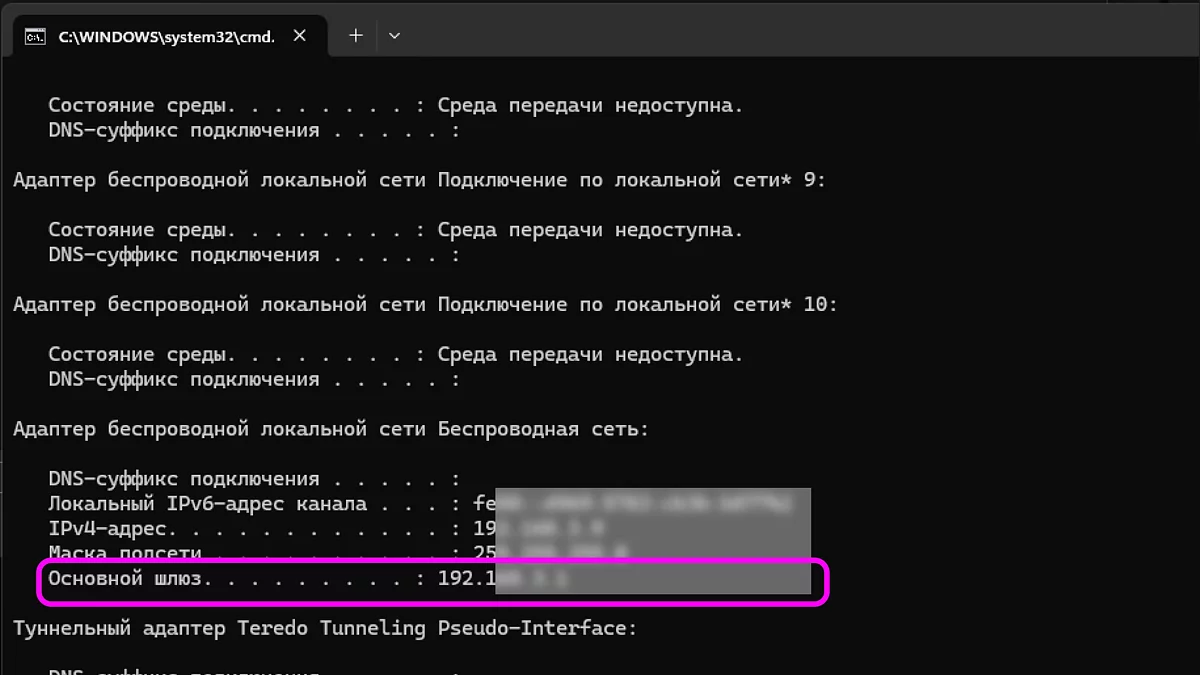 Если доступ к роутеру через браузер невозможен, можно узнать его IP через командную строку на Windows, набрав команду ipconfig. В разделе «Основной шлюз» будет указан IP-адрес вашего роутера.