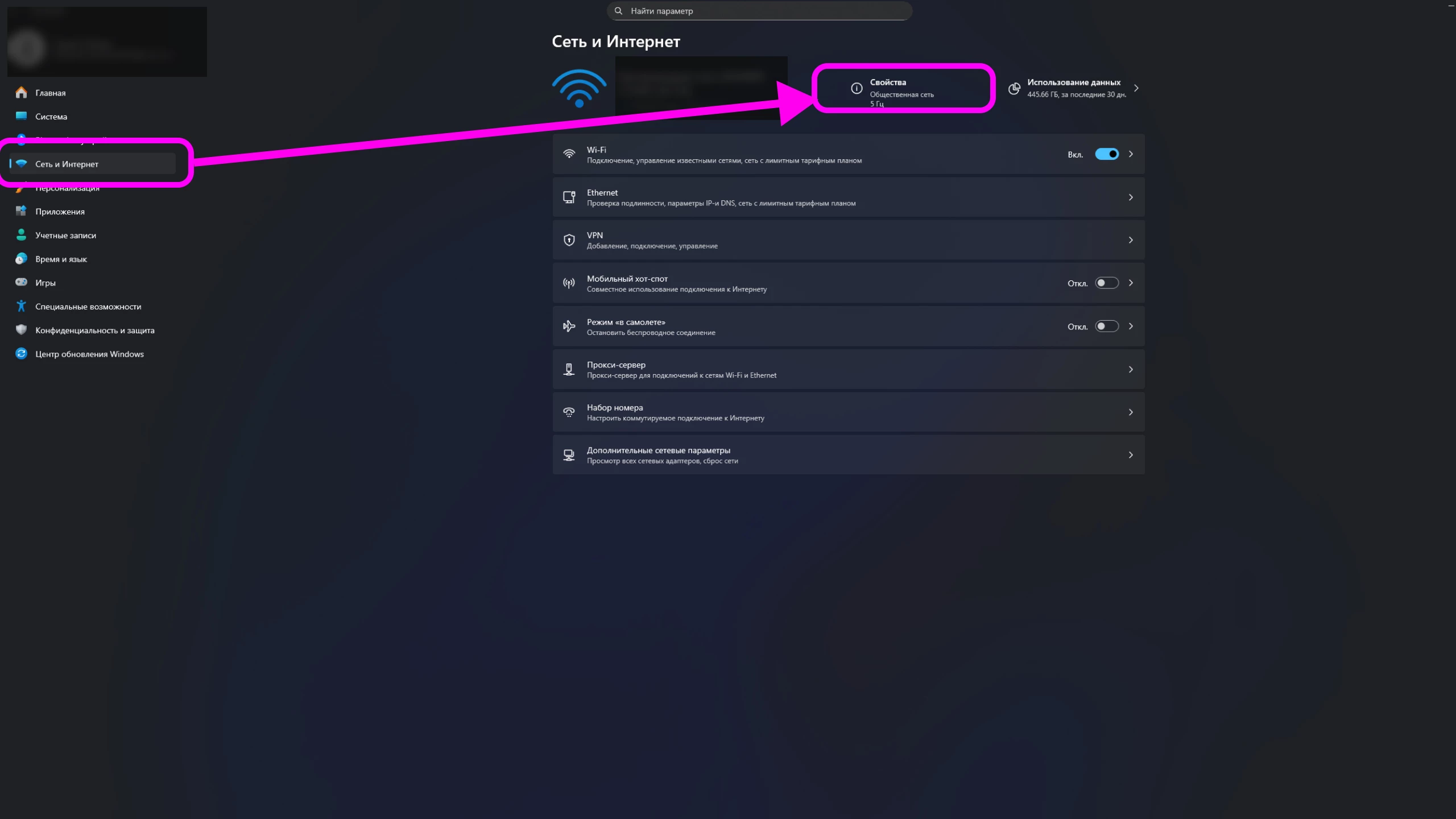 Оттуда переходим во вкладку «Сеть и интернет», а затем в «Свойства» сверху.