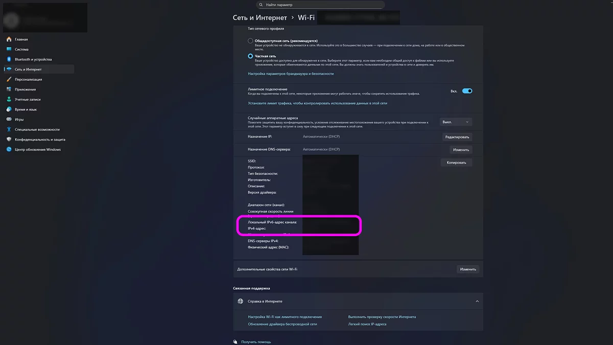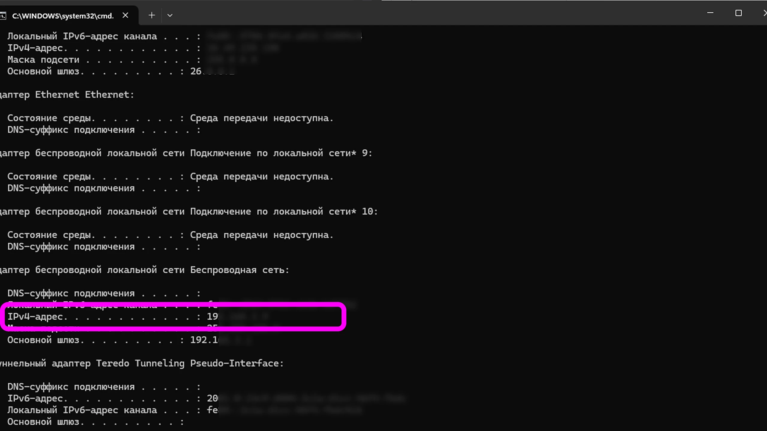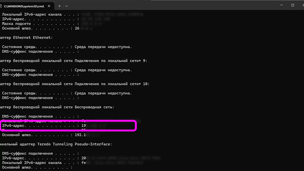 Под строкой «Адаптер беспроводной локальной сети» найдите пункт «IPv4-адрес».