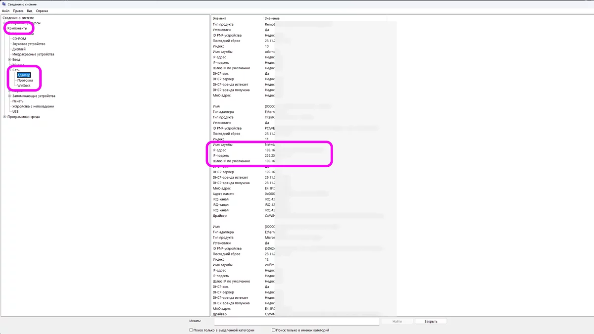Открываем «Компоненты» — «Сеть» — «Адаптер» и листаем в самый низ списка, пока не найдем пункт «IP-адрес» с набором чисел, который похож на формат адреса.