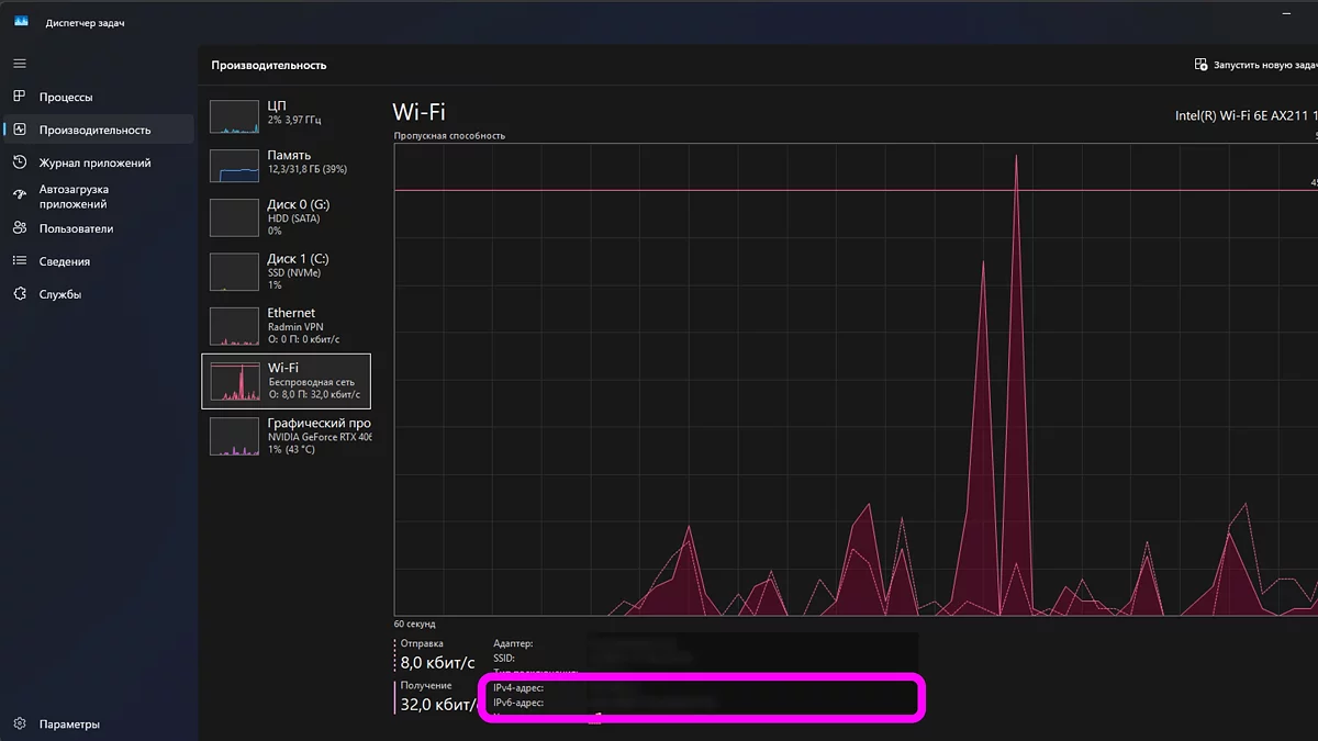 Перейдите во вкладку «Производительность» и откройте пункт «Wi-Fi». В строке «IPv4-адрес» будет находиться необходимый набор чисел.