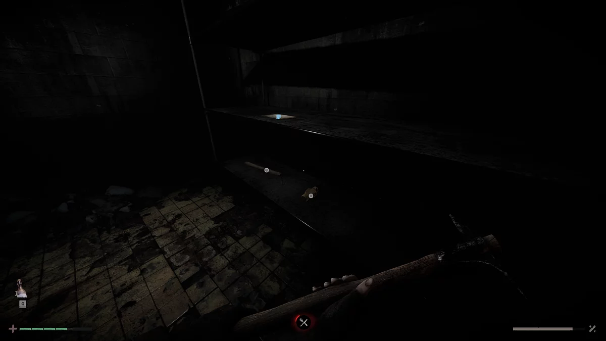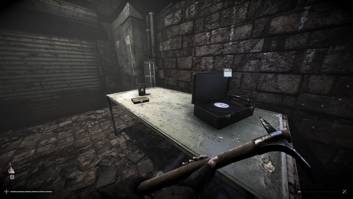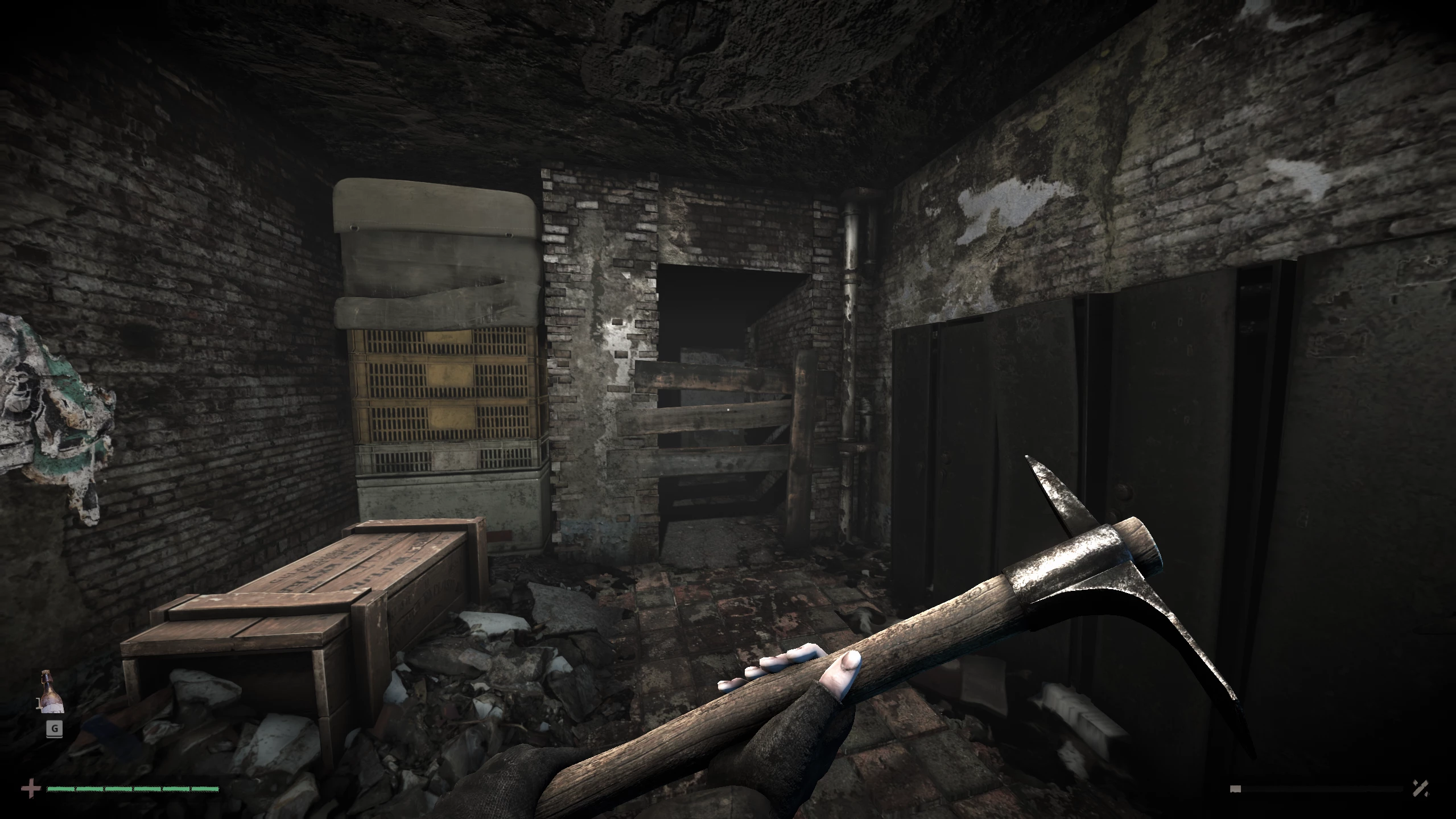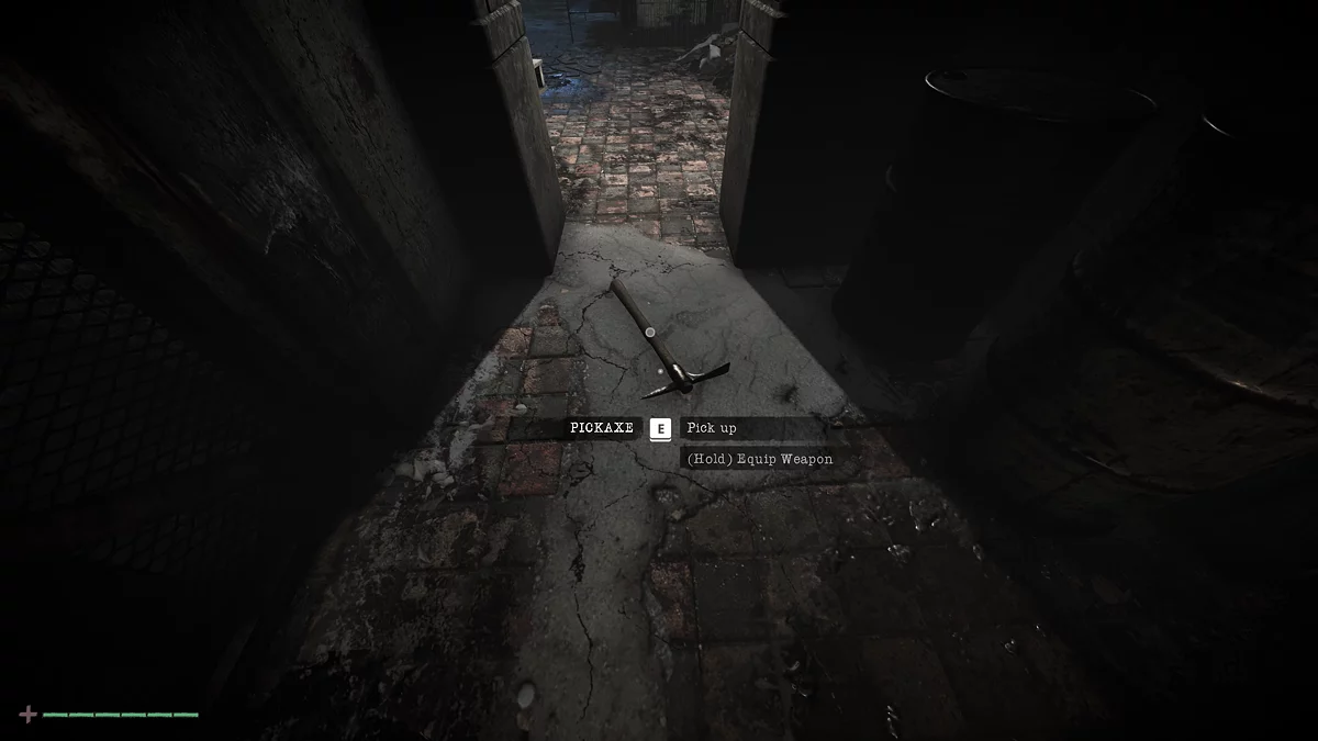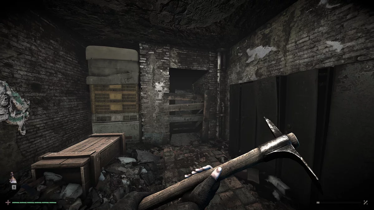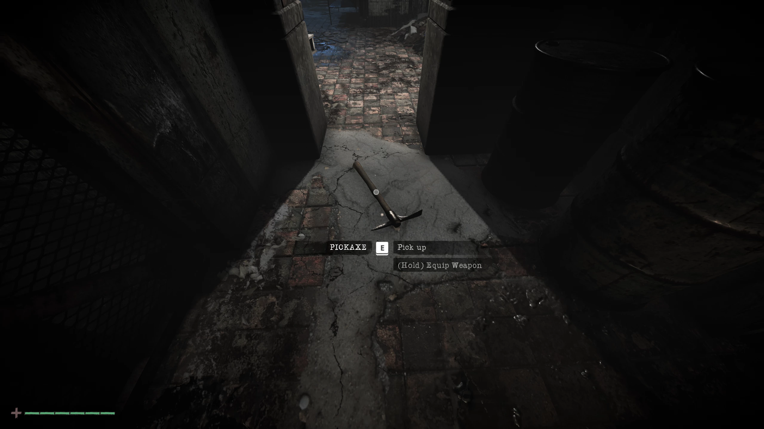 Перед открытой решеткой будет лежать первое оружие ближнего боя — кирка. При атаке она может разрушать деревянные ящики, разбросанные по всему зданию, чтобы получить различные крафтовые материалы или припасы. На данный момент у нее не так много прочности, поэтому стараемся использовать ее только по назначению, а именно для разрушения досок, препятствующих нам на пути.