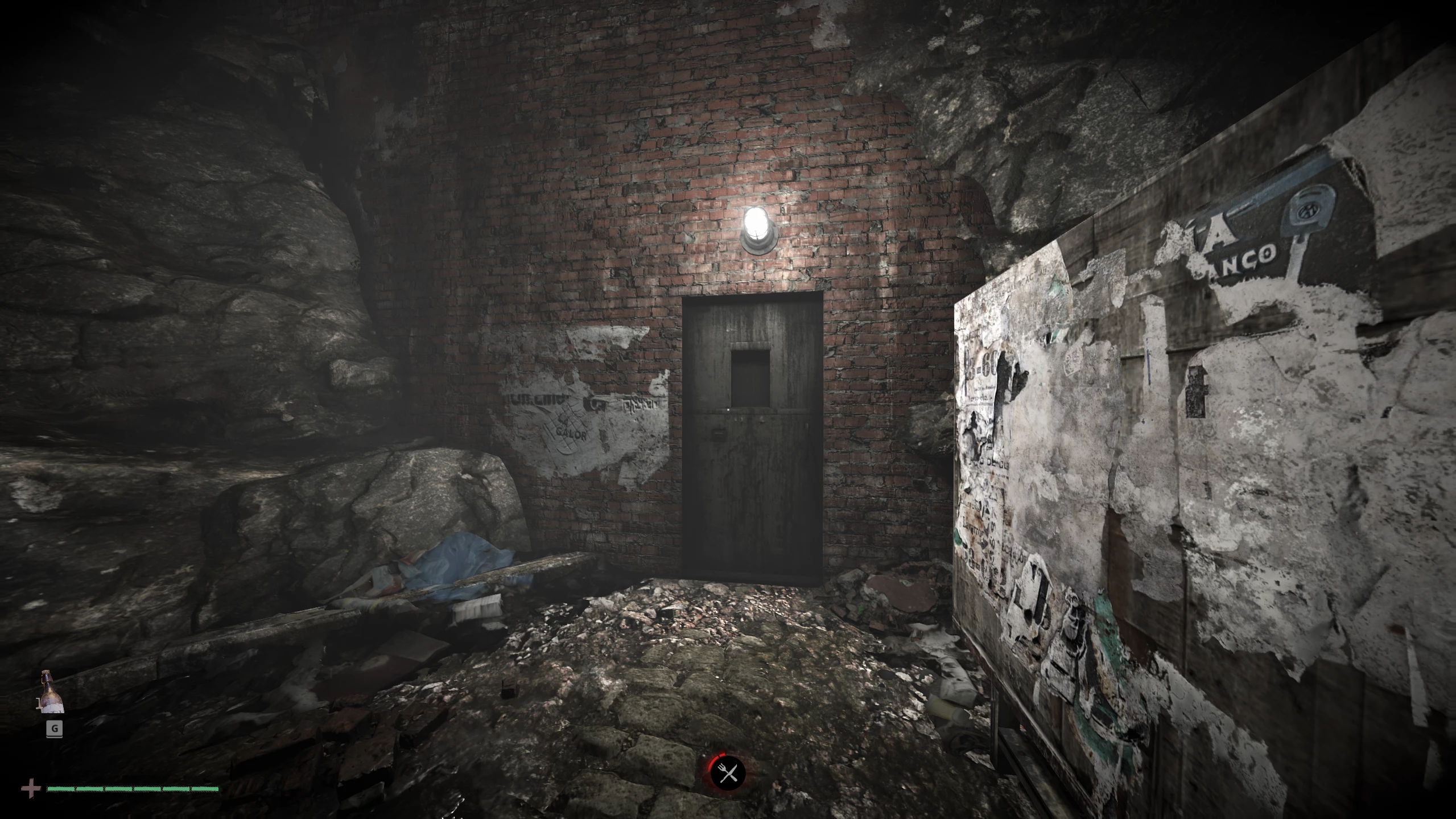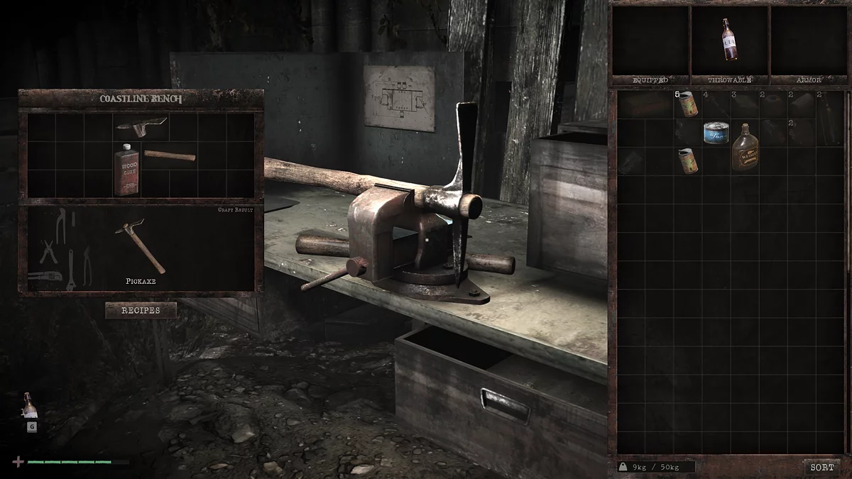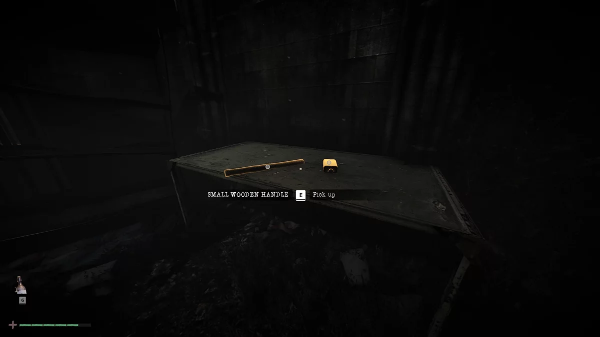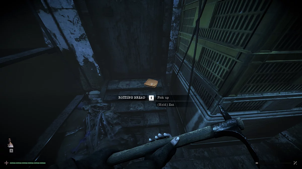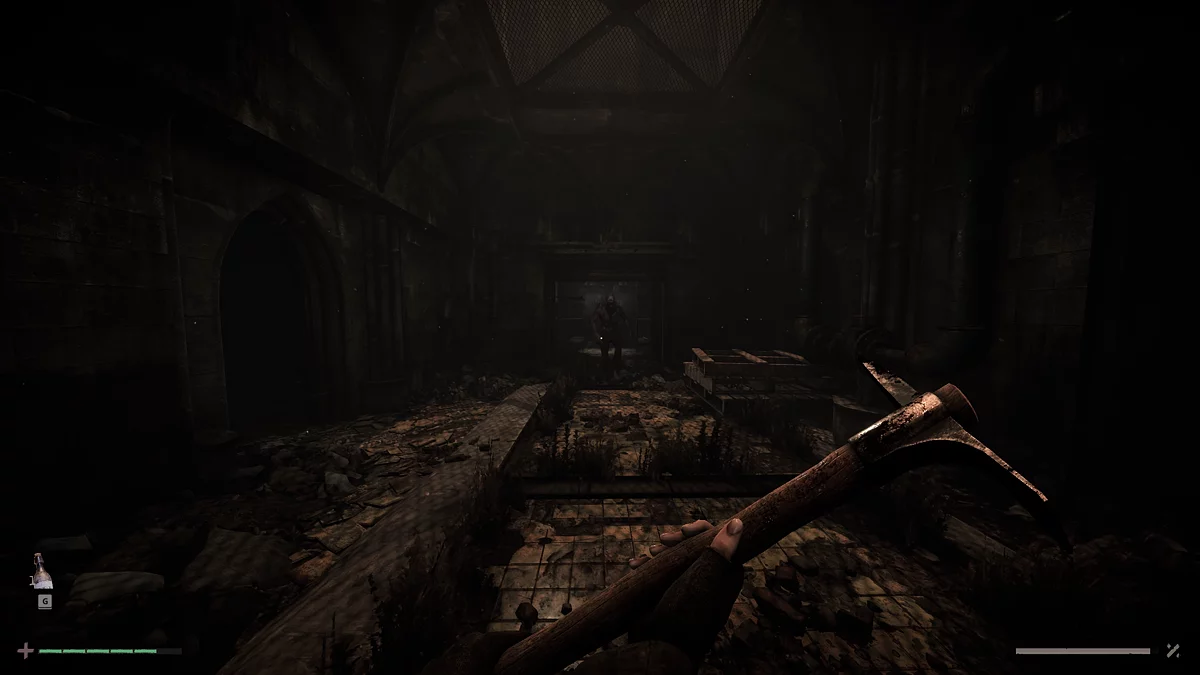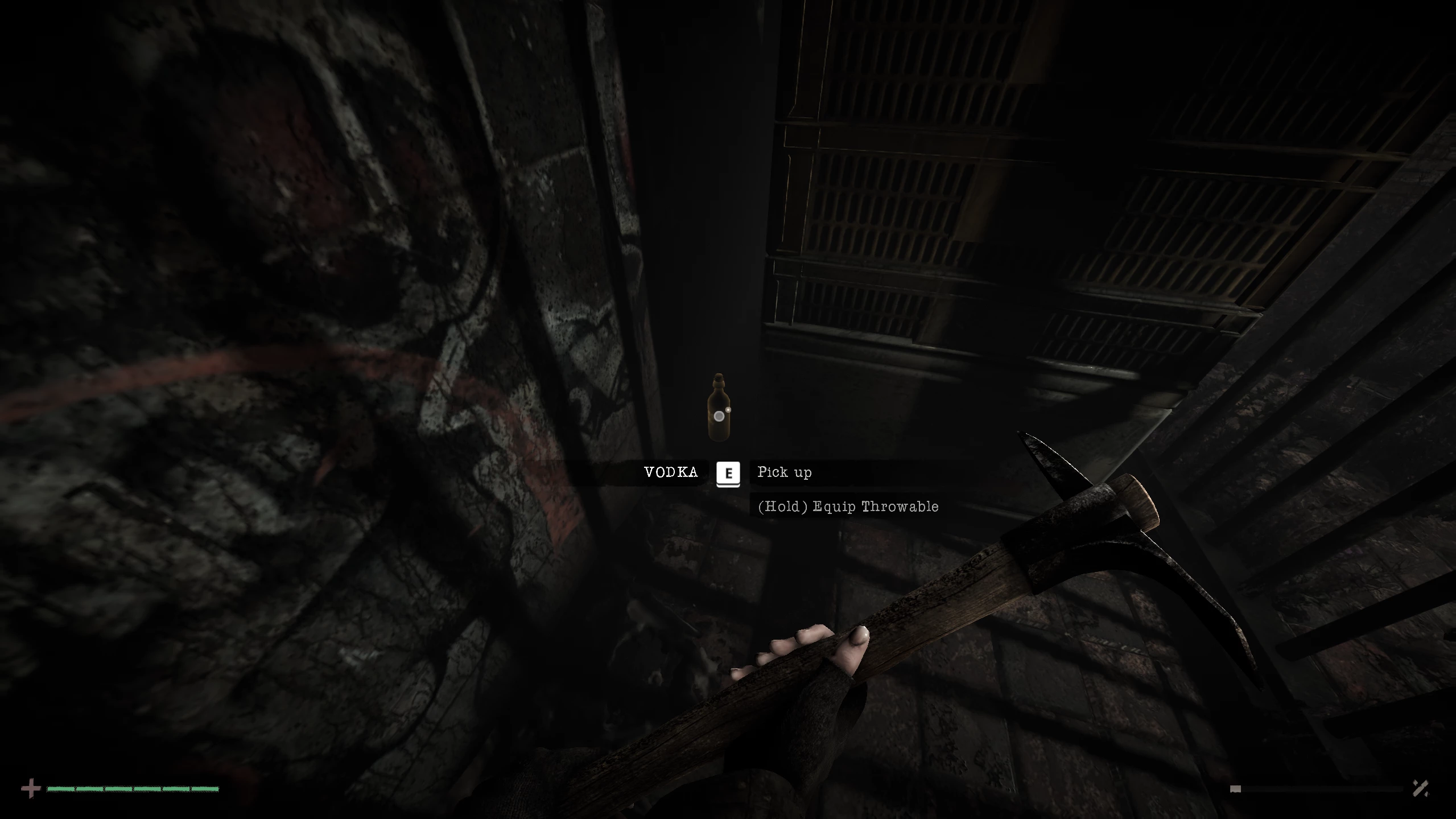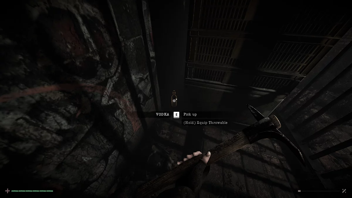 Перед открытой решеткой будет лежать первое оружие ближнего боя — кирка. При атаке она может разрушать деревянные ящики, разбросанные по всему зданию, чтобы получить различные крафтовые материалы или припасы. На данный момент у нее не так много прочности, поэтому стараемся использовать ее только по назначению, а именно для разрушения досок, препятствующих нам на пути.