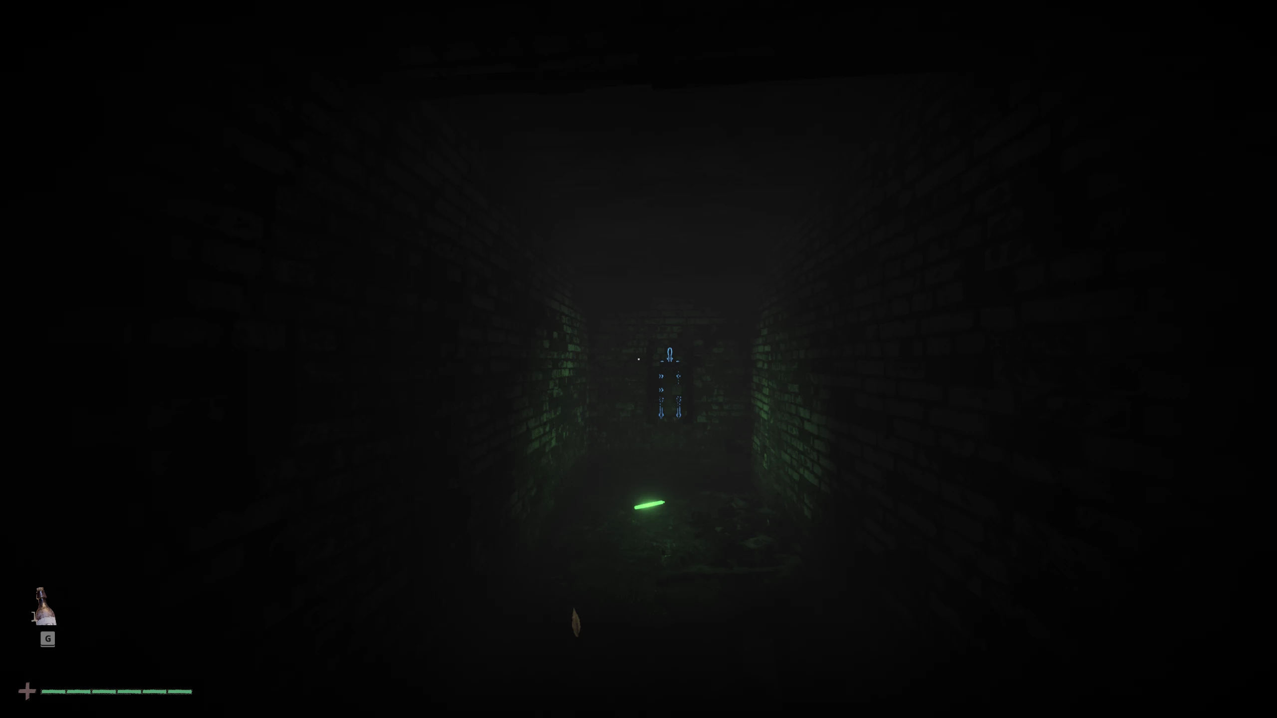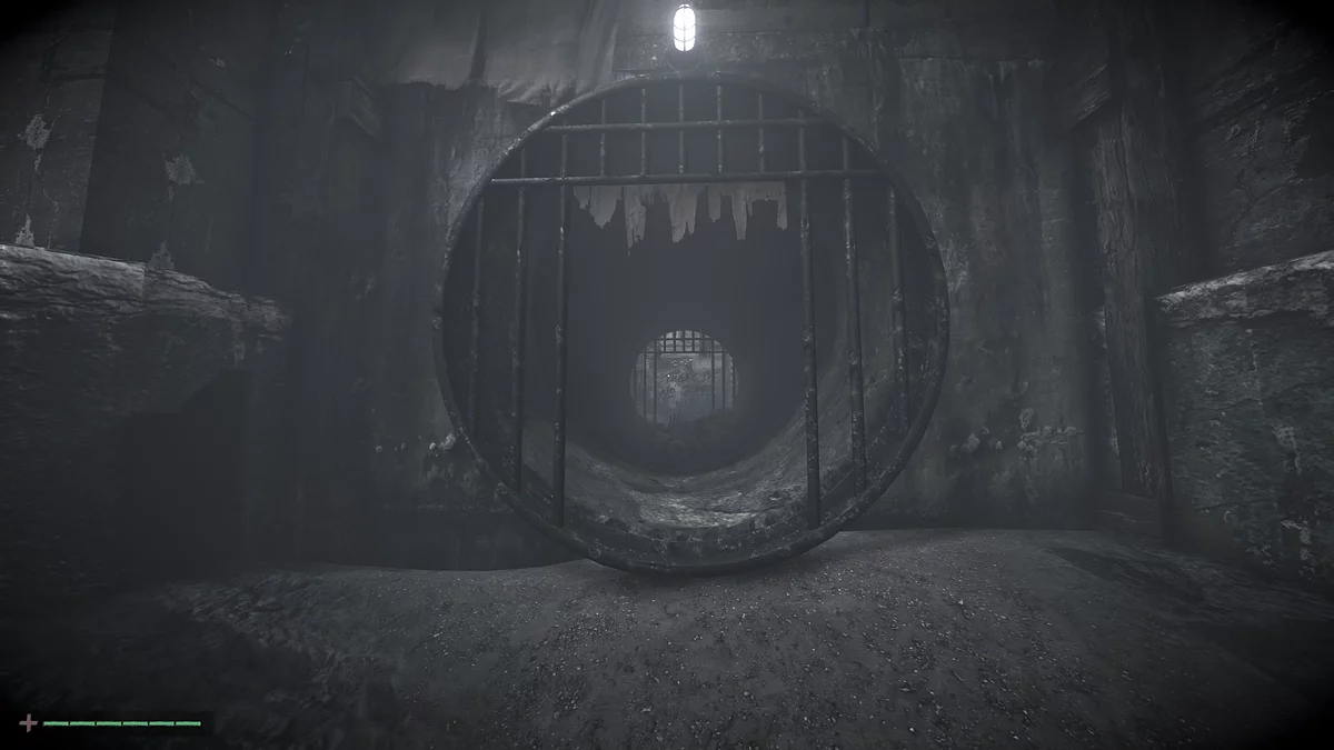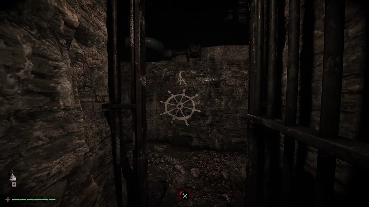 В комнате обнаруживаем очередную длинную, темную канализационную трубу. Другого выбора кроме как пройти через нее у нас нет, поэтому преодолеваем свой страх и доходим до противоположного конца. Поворачиваем направо и снова пробегаем через узкий гнетущий коридор, по пути замечая запертую дверь и некий символ на стене справа.