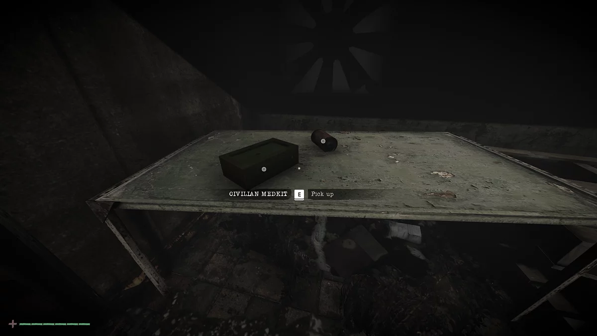 Возвращаемся к двери, открываем ее и подбираем на столе впереди медицинскую аптечку, банку с тушенкой, а также не забудьте поднять шприц возле двери.