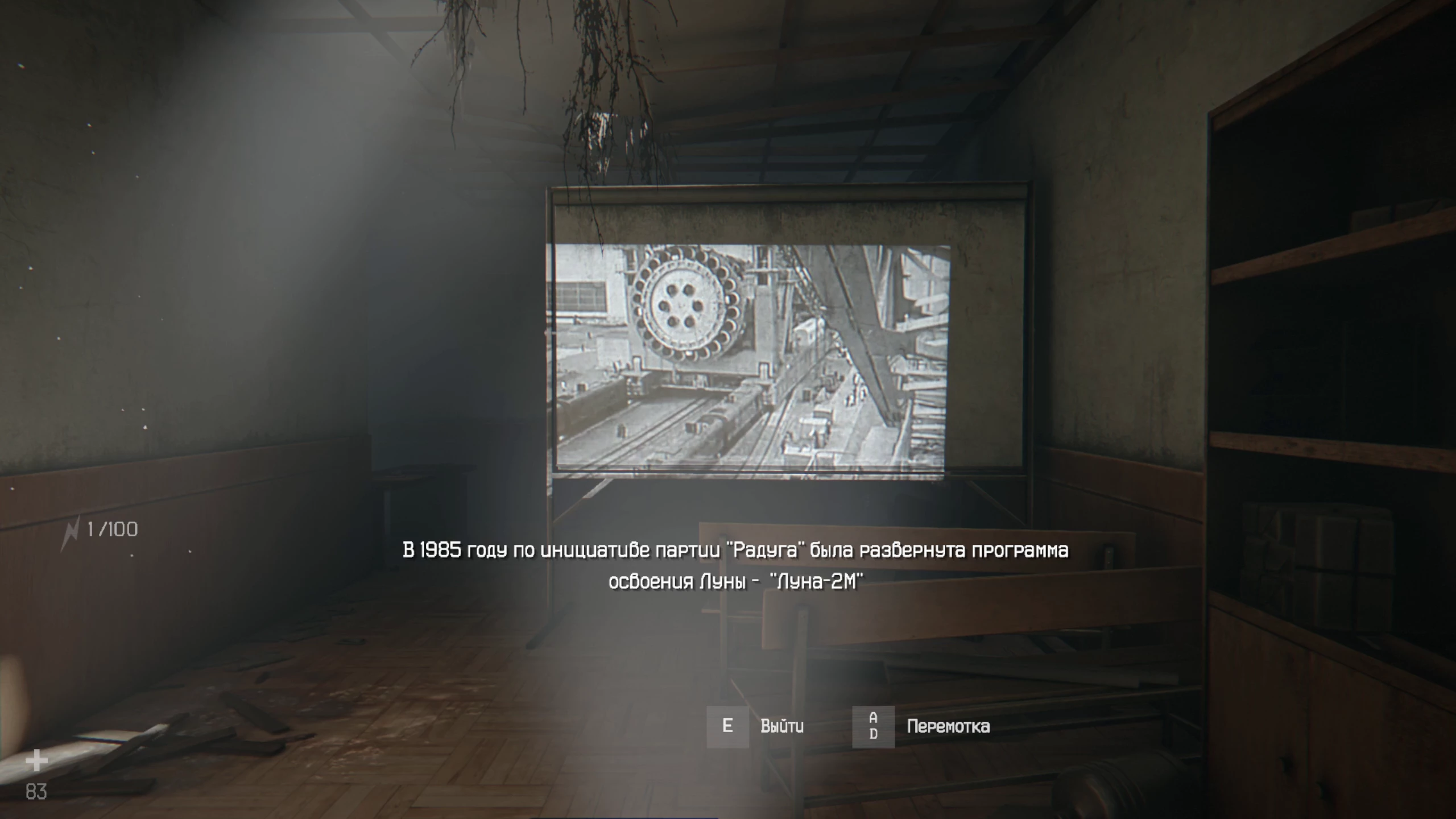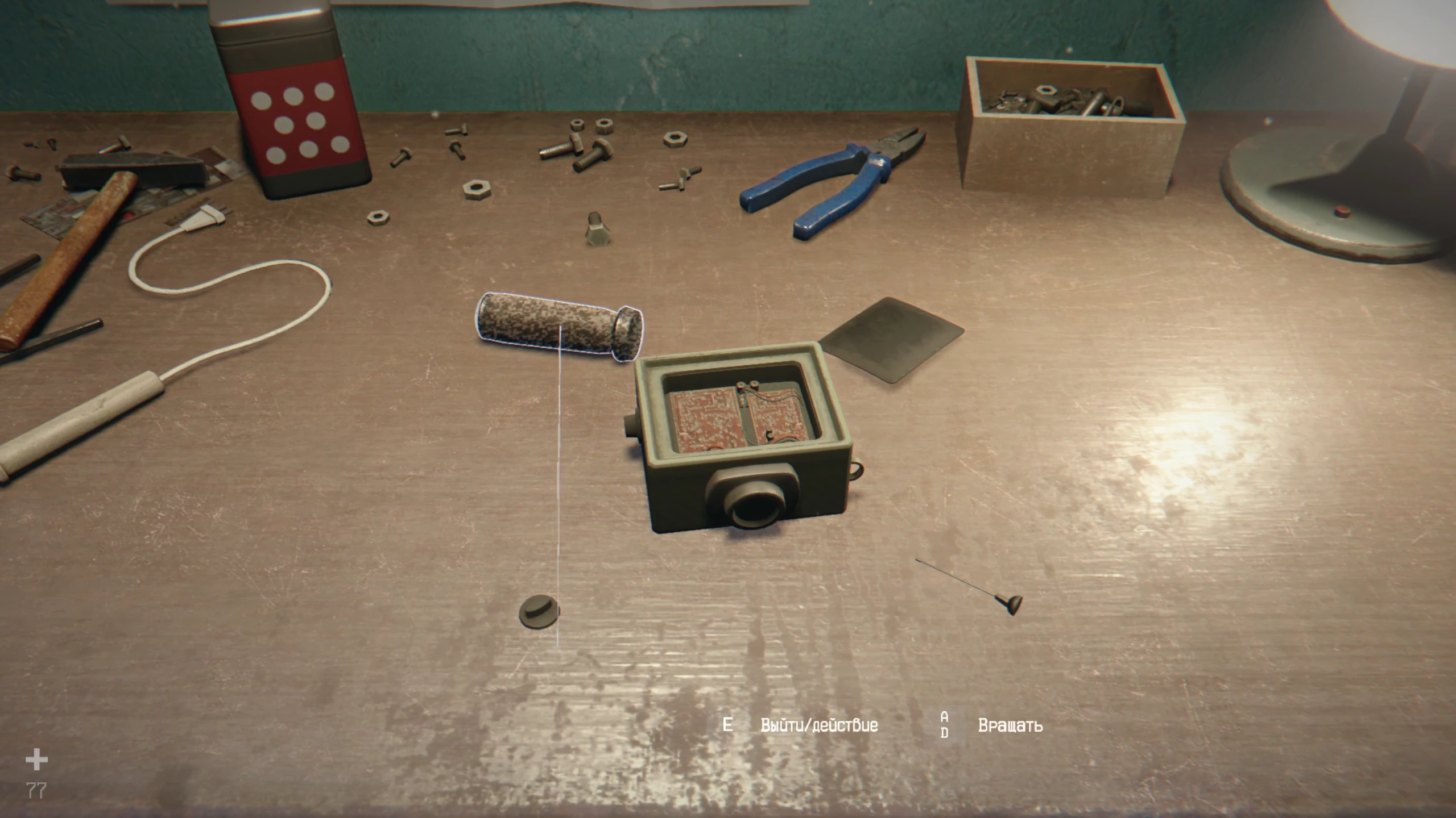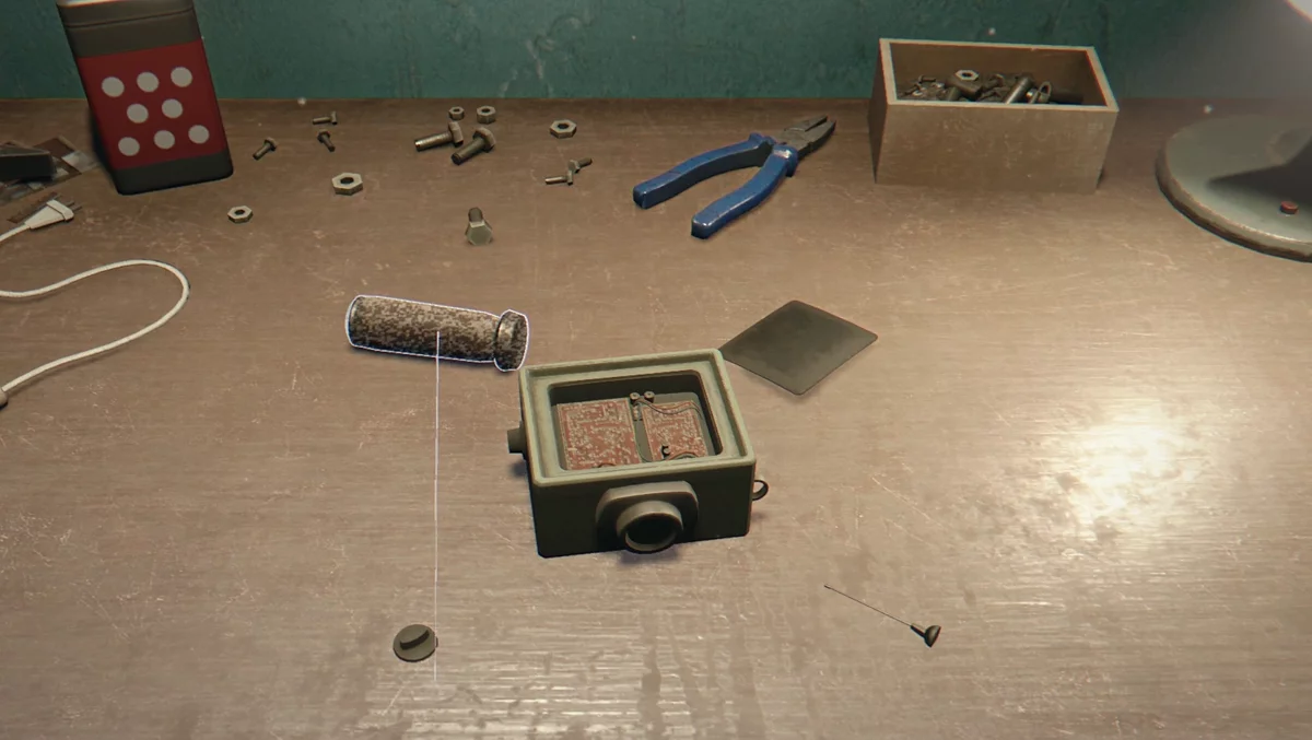 После катсцены можете изучить сообщения на компьютере, чтобы открыть достижение «Вести из прошлого». Исследуйте бункер и подберите все расходники. Доберитесь до импровизированной мастерской, где лежит разобранный механизм. Чтобы его починить, нужно взять элемент конструкции на ЛКМ и вставить его в нужное место. Крышка ставится на корпус, ручка в нижнюю часть (для её установки нужно будет некоторое время удерживать точку в указанной области). После этого вращайте установку, чтобы установить на верхнюю часть переключатель и антенну. Собрав, заберите экземпляр детектора для обмена и идите в свою комнату. Изучите планшет на столе и ложитесь спать.