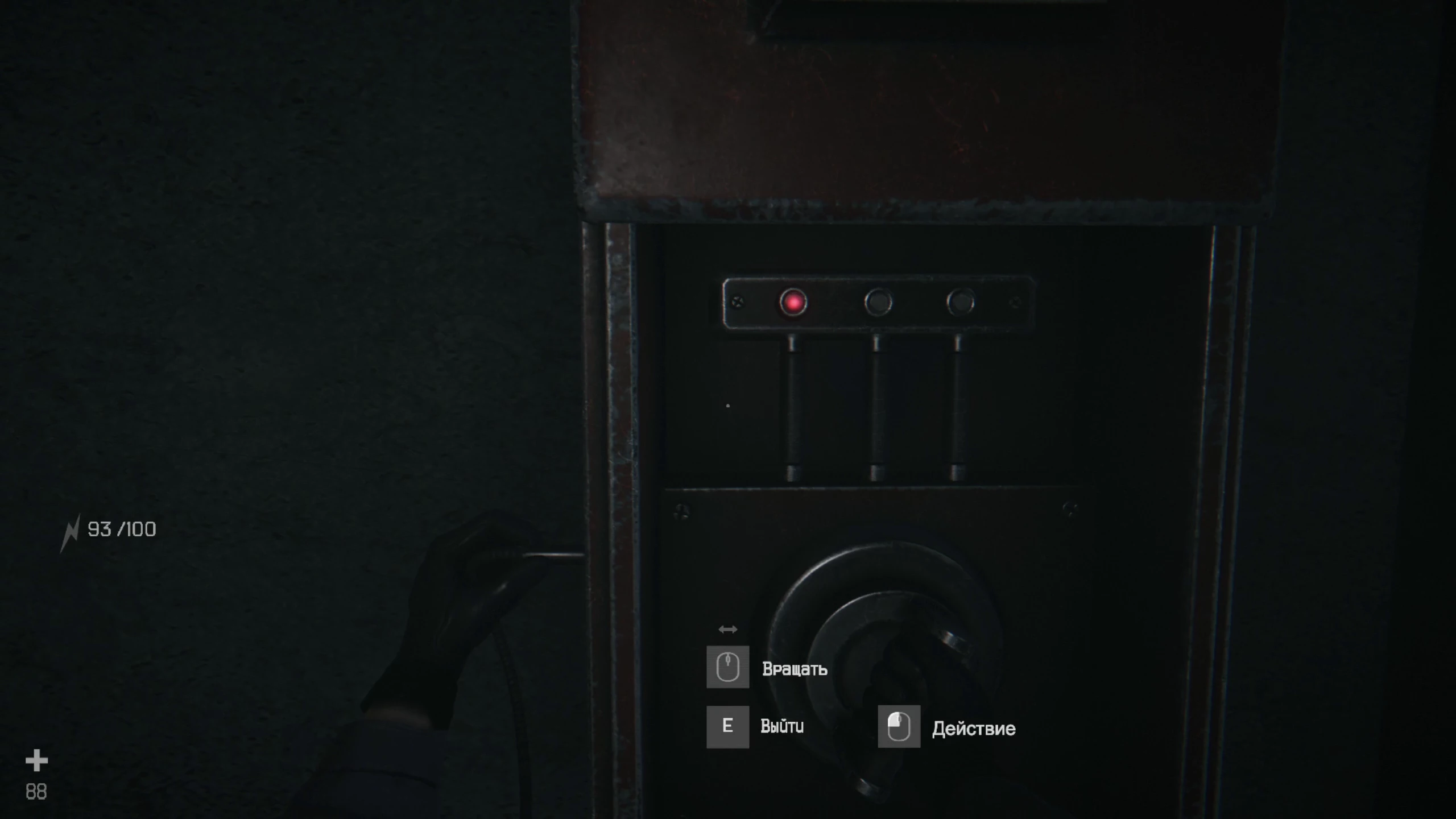 Немного дальше, по левой стороне, будет электрический щиток. Подключитесь к нему и трижды активируйте механизм. Для этого крутите ручку и нажимайте ЛКМ, когда красный огонь будет ярко мигать. В шкафчике рядом лежат продукты питания. Поднимайтесь по лестнице и по пути подберите продукты питания на полочке, а напротив — запасную батарею. Двигайтесь по правой стене в туалет, где в раковине лежит рукоять лебёдки.