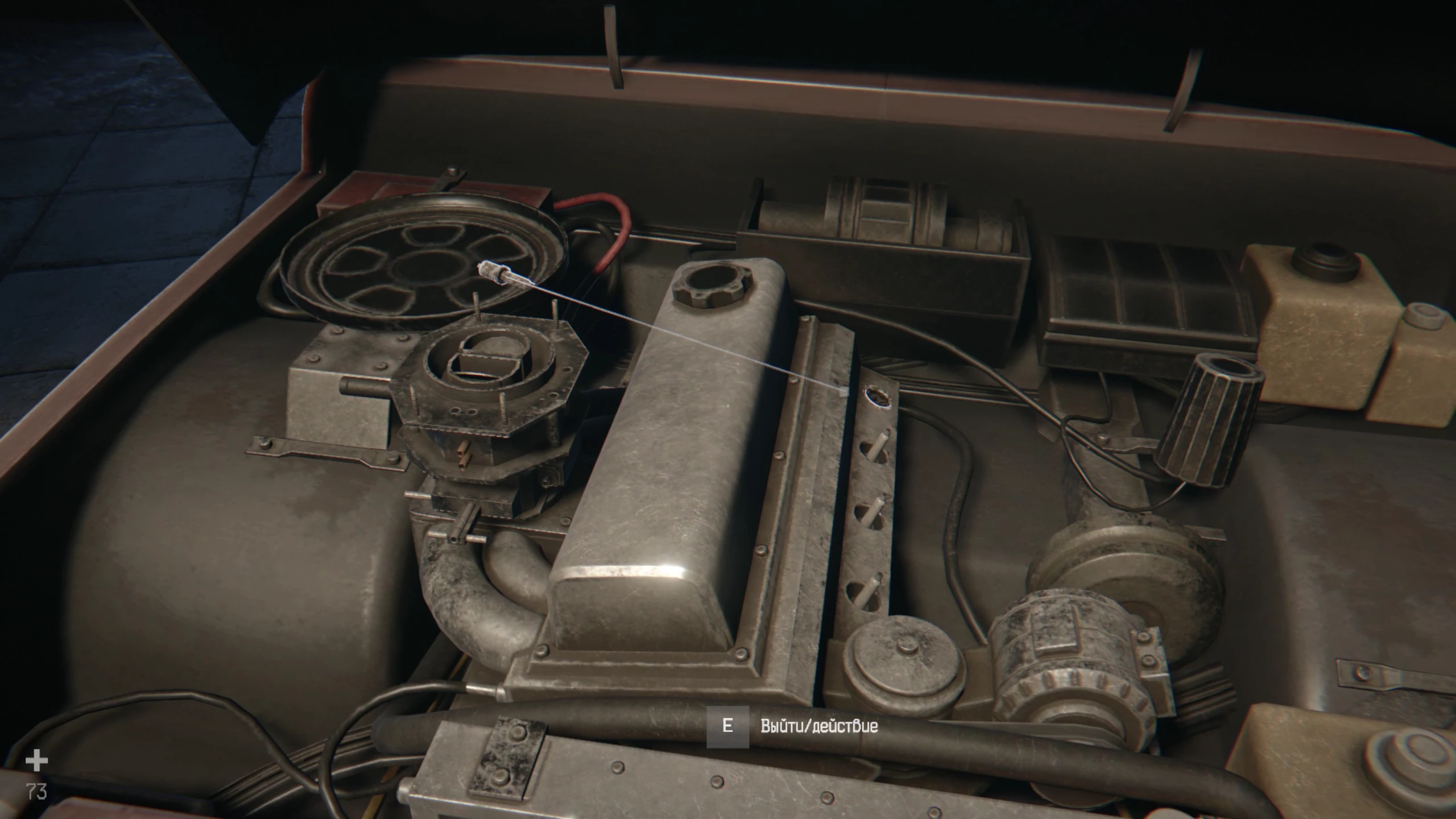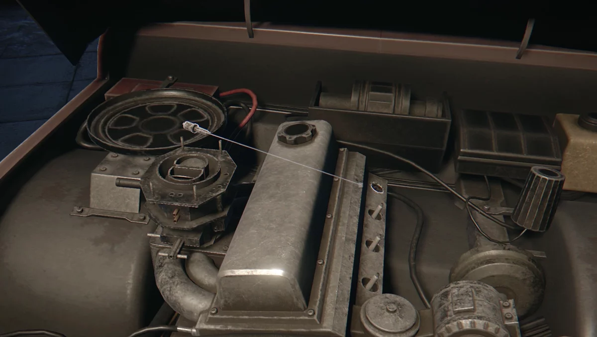 На воротах будет лёд, который можно разбить слесарным ключом. Заходите в гараж и активируйте свет, нажав рубильник на стене. Изучите список дел на рабочем столе, после чего приступайте к ремонту. Подойдите к передней части машины и взаимодействуйте с двигателем. В левой дальней части у вас появятся предметы, которые нужно установить в нужное место. Большое устройство необходимо разместить на круглую платформу в левой части. А четыре свечи зажигания разместить справа в небольшие отверстия.
