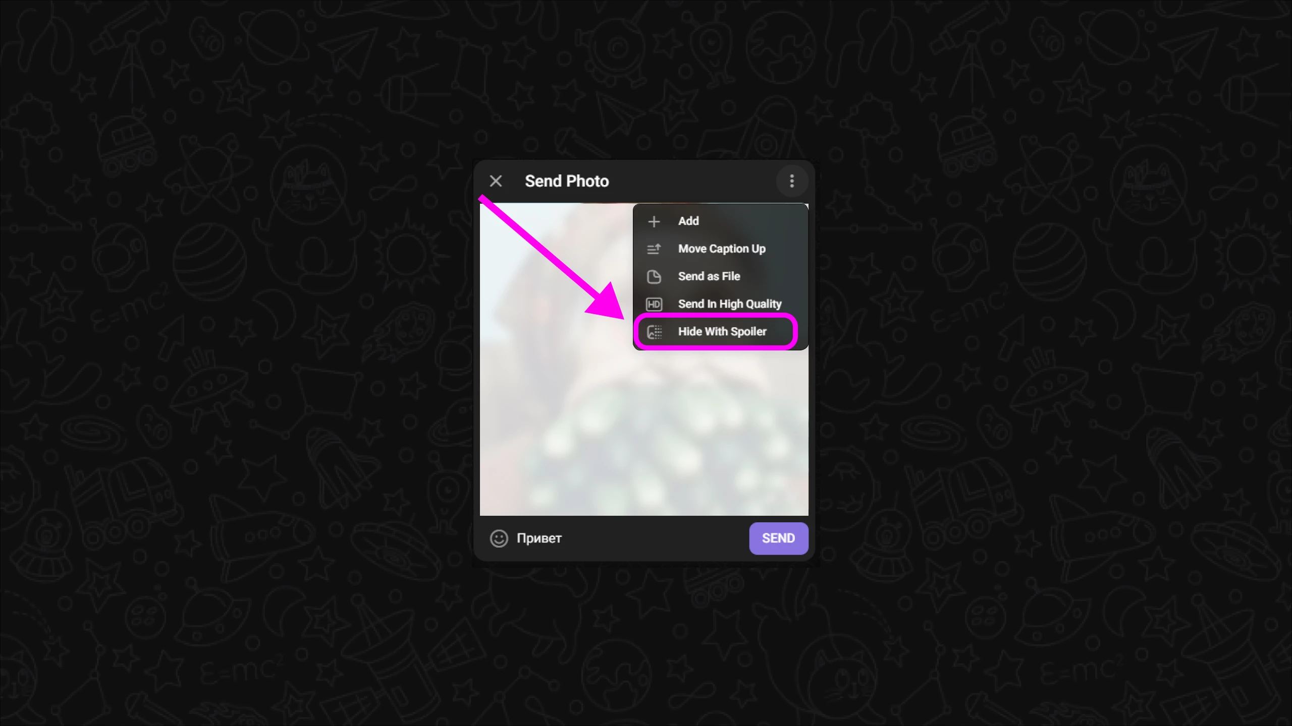 - На смартфонах при выборе отправляемого файла аналогично выберите троеточие сверху и используйте вкладку «Скрыть под спойлер».