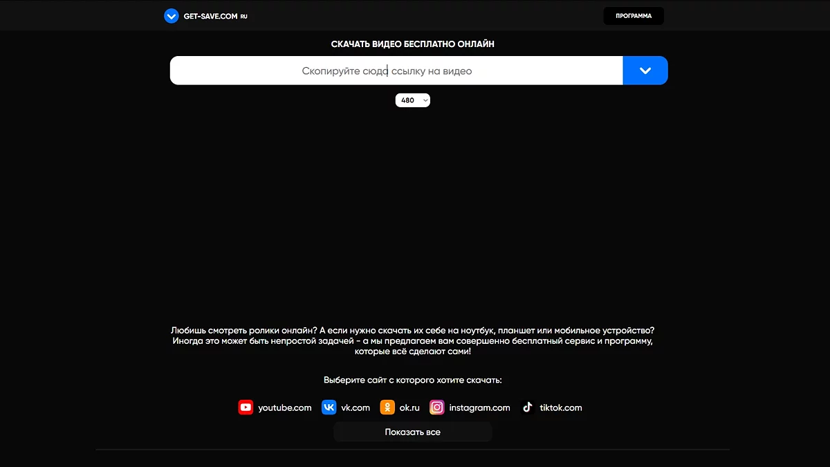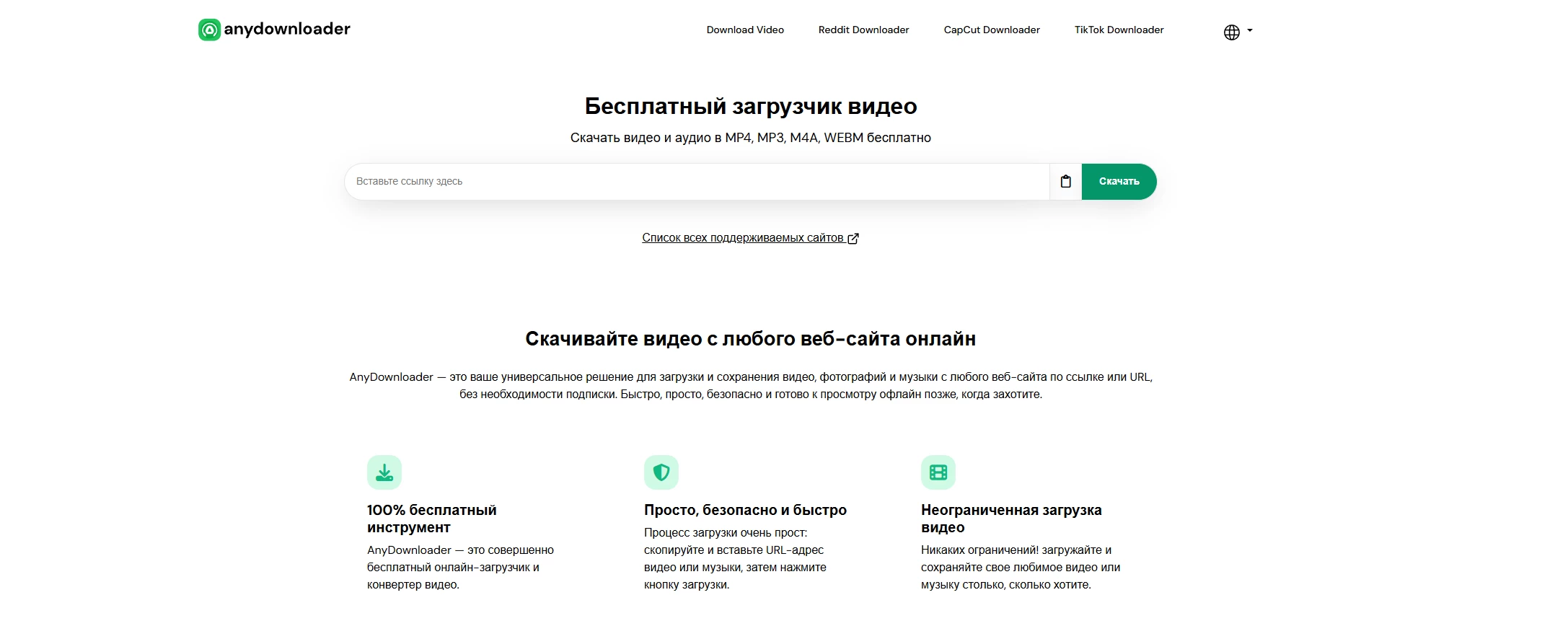 Онлайн-сервис представляет собой универсальный и удобный инструмент для скачивания видео и аудио с более чем 700 популярных сайтов: от YouTube, Instagram* и TikTok до Facebook*, Twitter, VK, Vimeo и других платформ. Также работает прямо в браузере, не требует установки программ и позволяет сохранять ролики в широком диапазоне качеств.