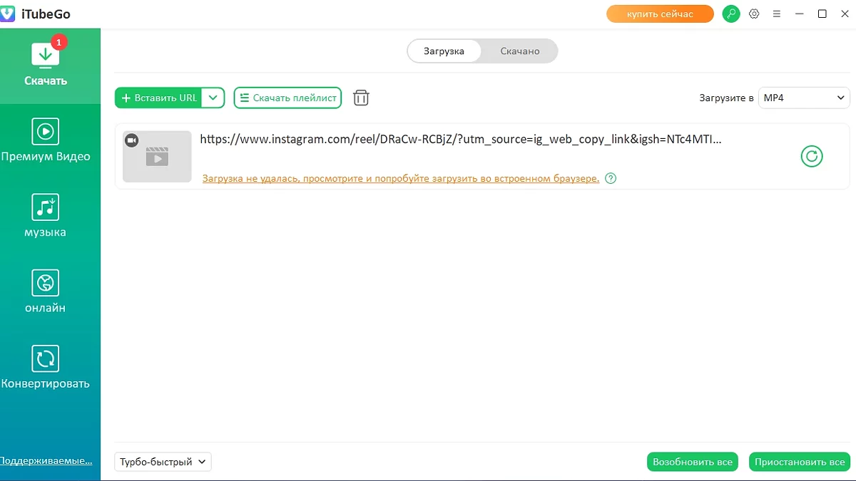 Простенький загрузчик, позволяющий в своей бесплатной версии скачивать видео только в формате MP4, а также аудио в формате MP3. Большинство форматов закрыты за платной подпиской в размере 20$ в месяц.