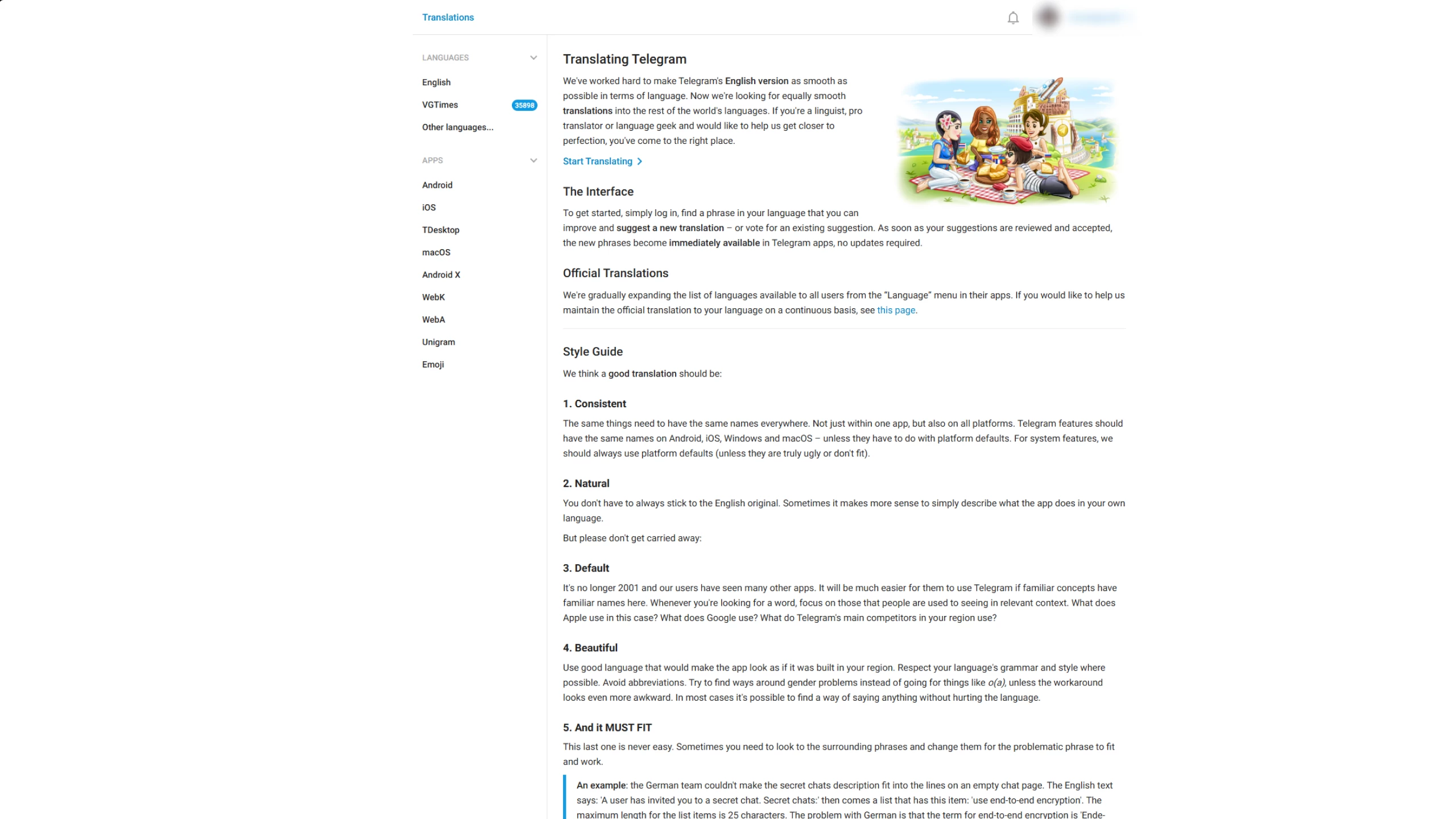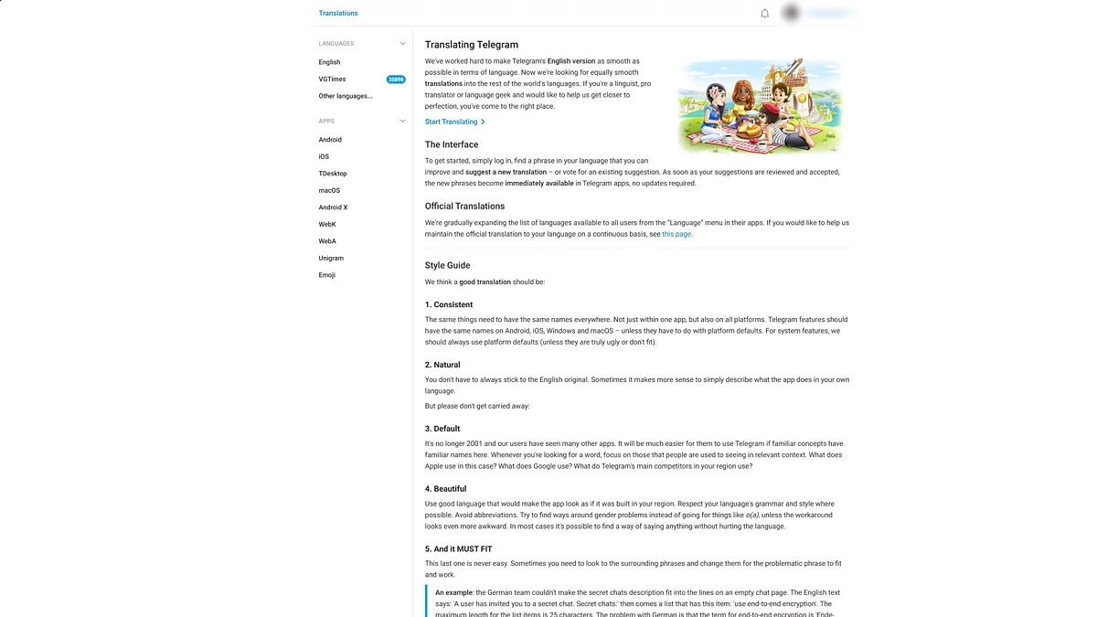 На главной странице сразу можно заметить основные принципы разработки своего перевода, которых стоит придерживаться: