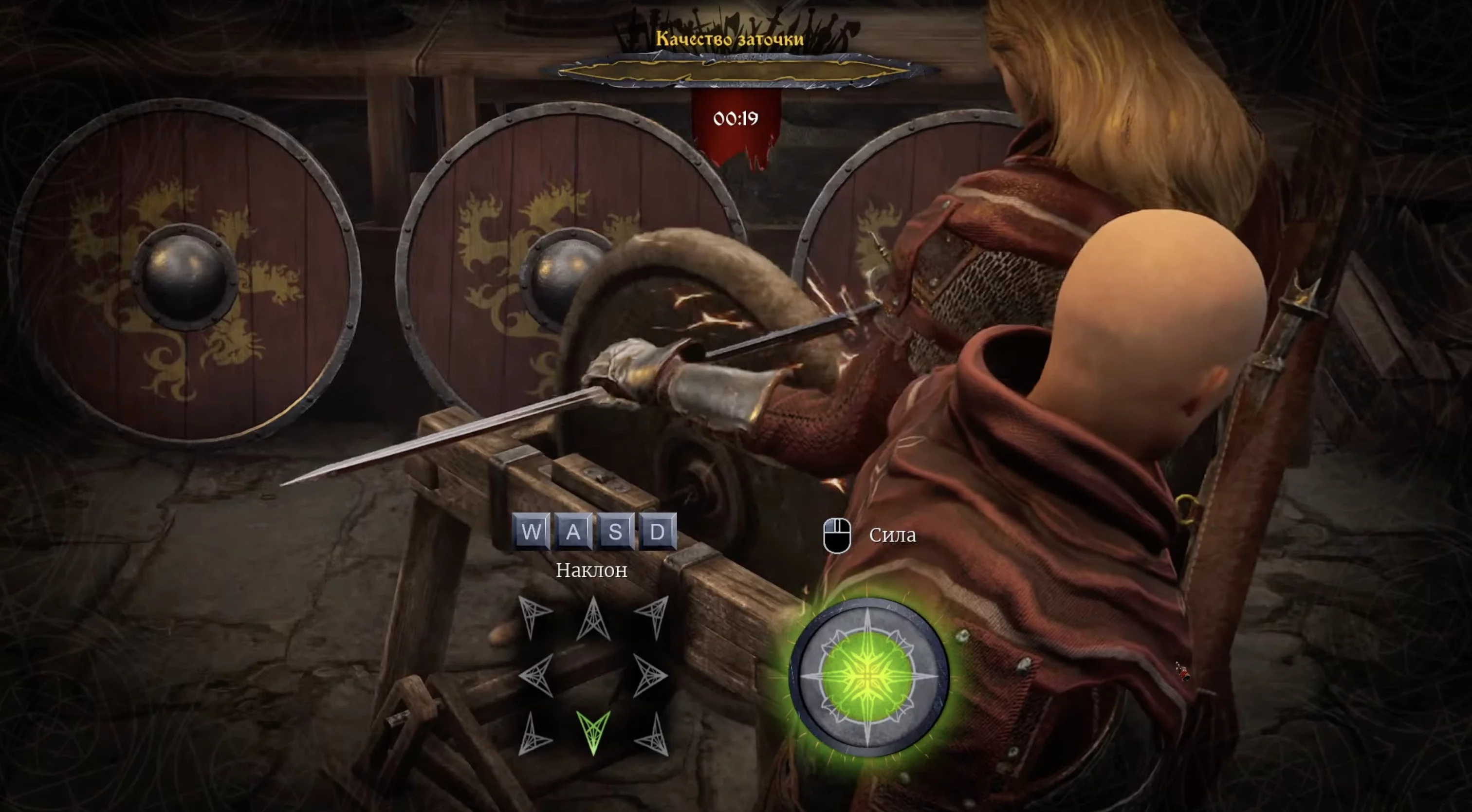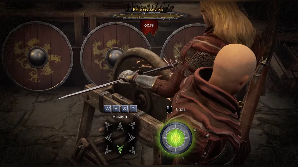 Для заточки требуется точильный камень или точильный круг. Круг всегда есть в кузнице и воспользоваться им можно бесплатно. Как только вы запустите процесс, откроется мини-игра, в которой вам нужно отрегулировать силу нажатия, а также угол. Силу придется выставлять мышкой до тех пор, пока зона не станет зеленой, а вот с углом все несколько сложнее. Клавиши загораются рандомно, а ваша задача — безошибочно на них нажимать. Проблема такого QTE в том, что на одну и ту же кнопку придется нажимать несколько раз, но сколько точно требуется таких нажатий до переключения угла — неизвестно. Если вы ошибетесь, прогресс сильно снизится, как и качество заточки.