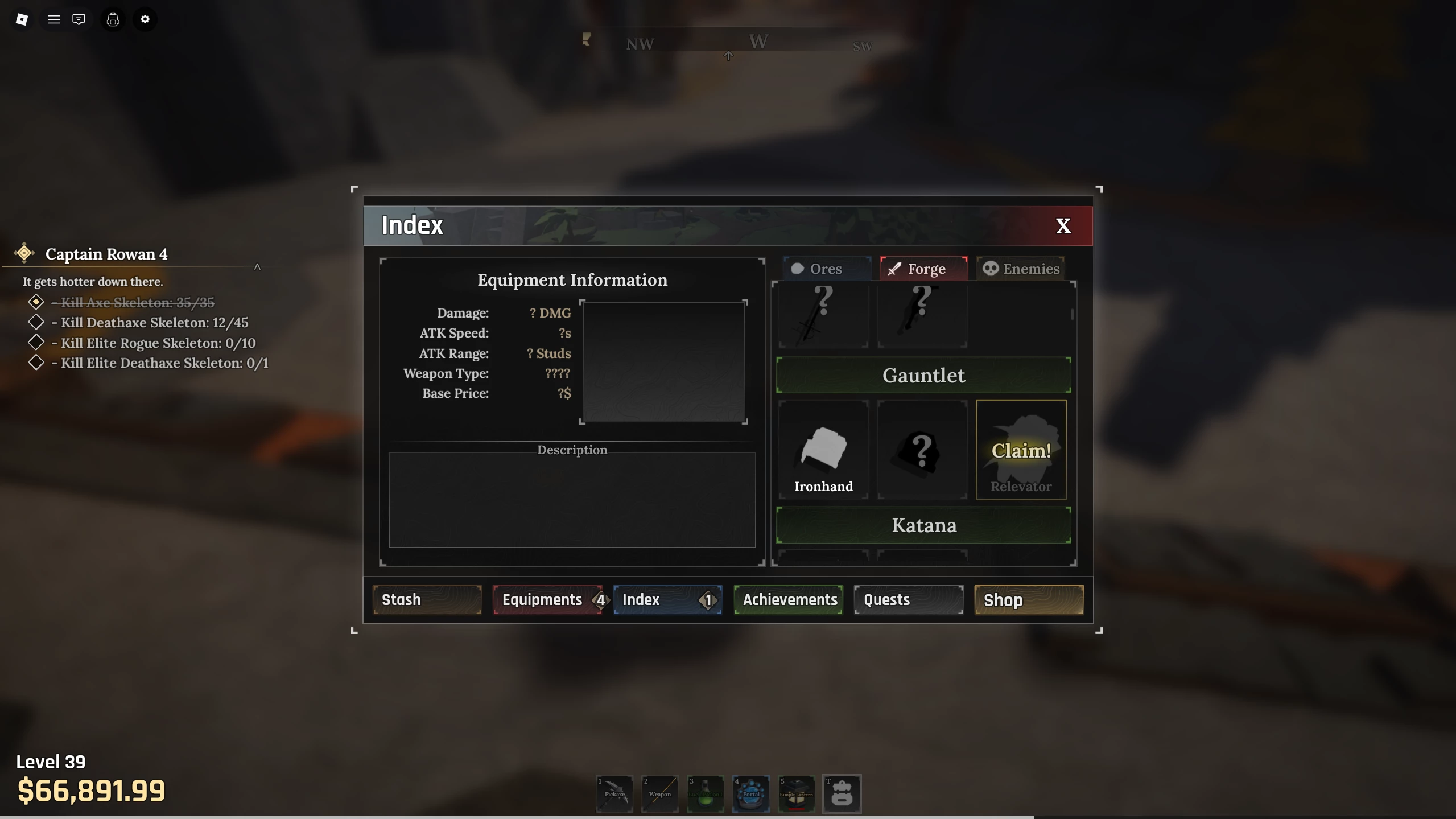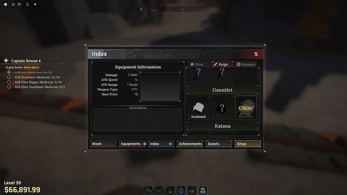 По мере прохождения игры игрок открывает новые записи в своем путеводном журнале, который фиксирует найденные виды руды, созданные типы брони и побежденных в мире противников. За каждое новое открытие в журнале появляется кнопка «Claim». Активация этой награды не только открывает запись, но и приносит дополнительное золото. Регулярная проверка Index позволяет получить заметное количество валюты без дополнительного фарма. Чем выше сложность созданной брони, руды или монстра, тем выше получаемая награда.