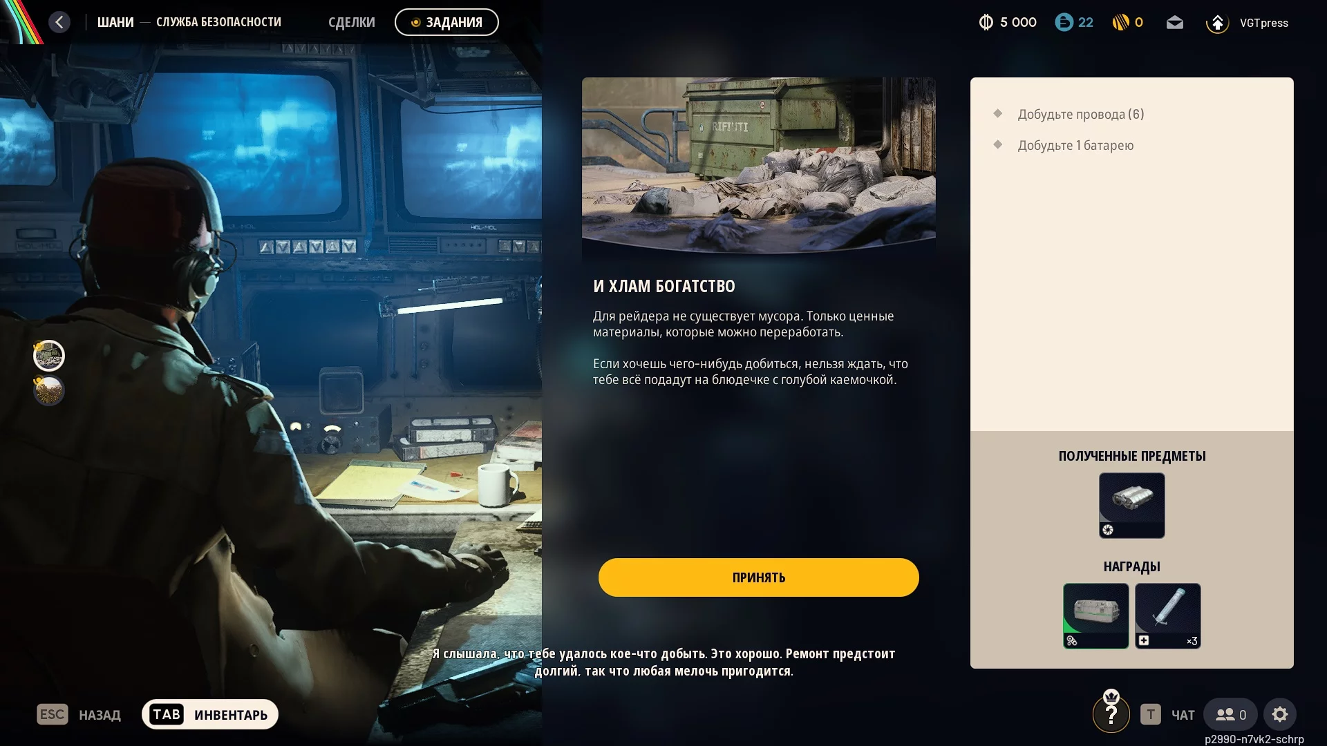 Очередное задание для игрока. Оно достаточно простое в исполнении и может выполняться параллельно с другими поручениями по ходу рейда. Однако квест требует выполнения всех условий за один раунд с обязательным успешным выходом из локации. Лучшим местом для прохождения является карта «Поле битвы у дамбы».