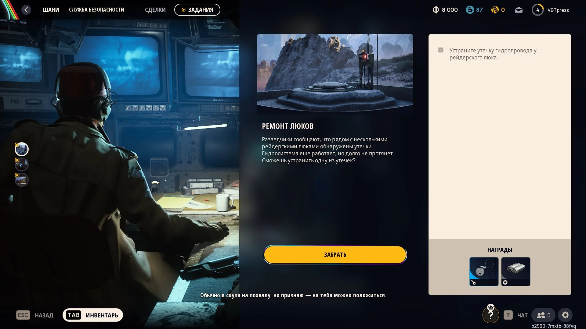 В этом задании Шани просит устранить утечку гидропровода у любого рейдерского люка. Для выполнения поручения подойдёт любая из доступных в игре карт, однако проще всего выполнить задачу на локациях «Поле битвы у дамбы» и «Космопорт».