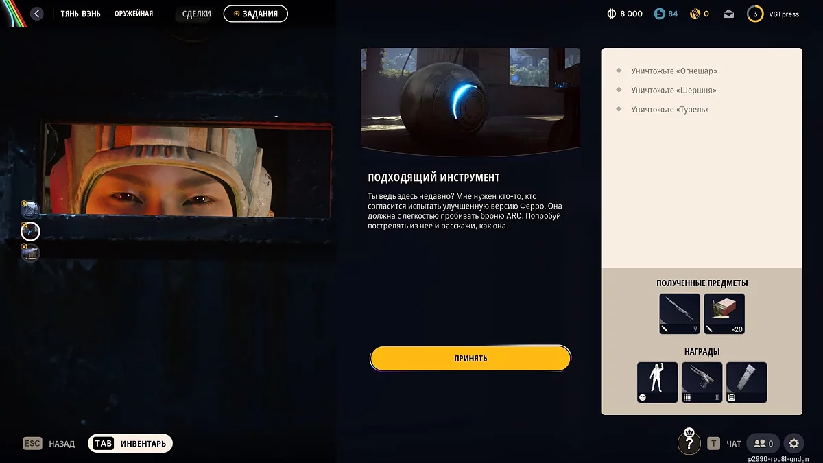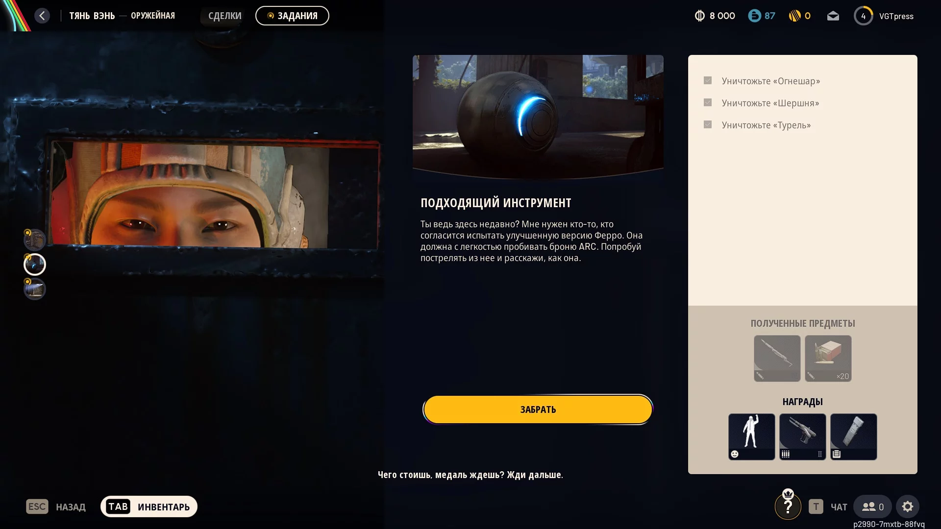 Задание не требует уничтожения всех машин за один игровой раунд — вы можете выполнять квест в несколько попыток. После успешного уничтожения всех необходимых ARC возвращайтесь к Тянь Вэнь и получите награду: