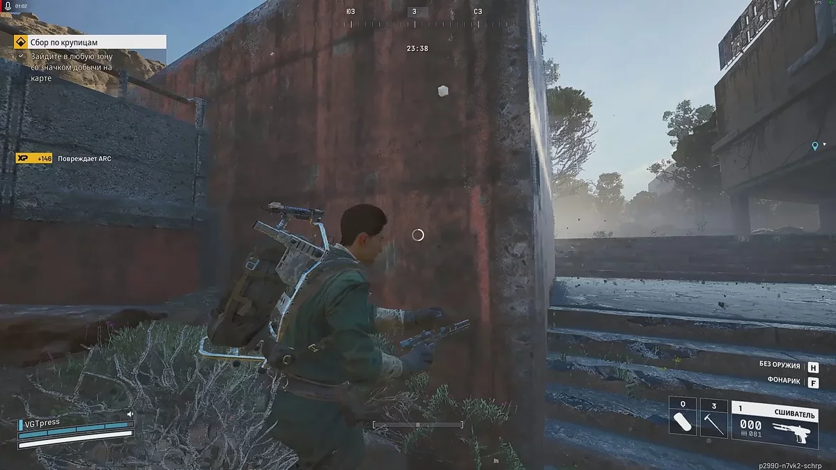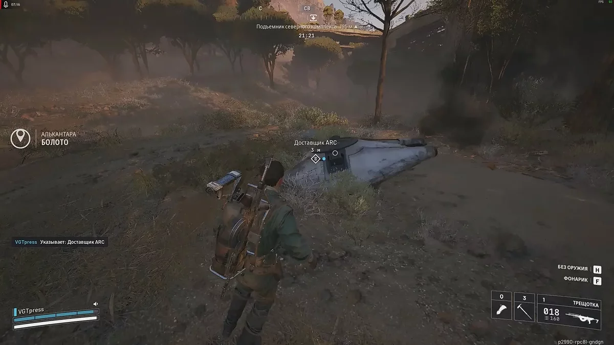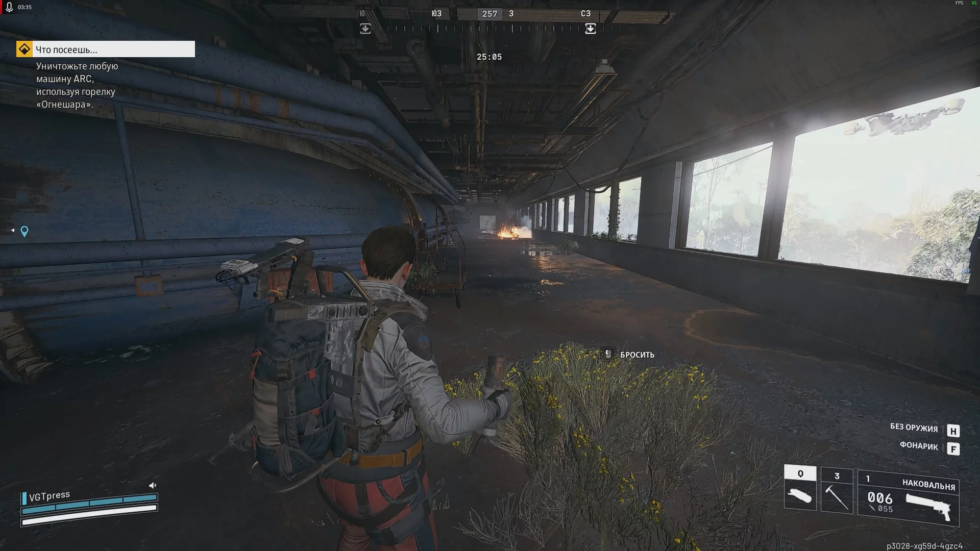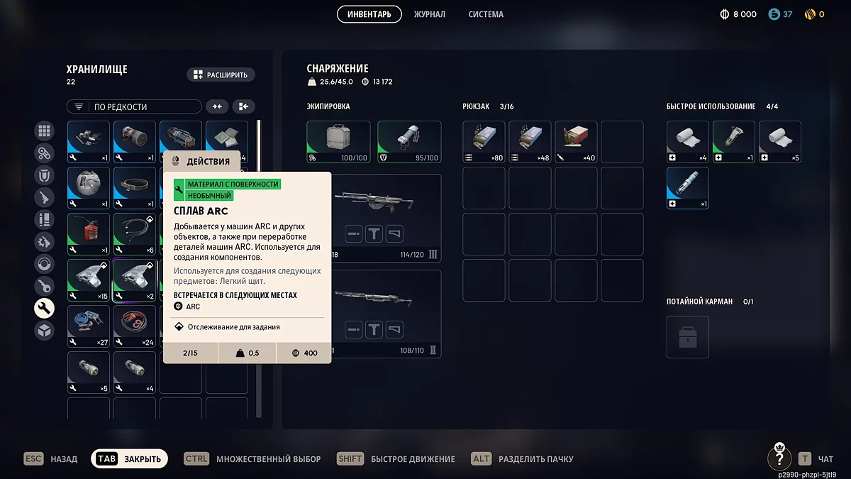Подойдите к уничтоженному ARC и начните обыск. Нас интересует предмет «Сплав ARC» — необходимо собрать 3 штуки.