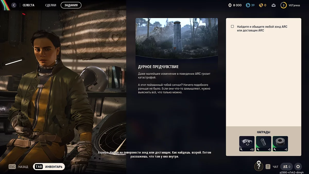 Селеста выдаёт игроку задание, в котором необходимо найти на карте и обыскать любой дрон или зонд ARC. Важно не перепутать их с активными боевыми роботами, такими как Оса или Огнешар. Для выполнения квеста требуется обнаружить одну из двух конкретных моделей.