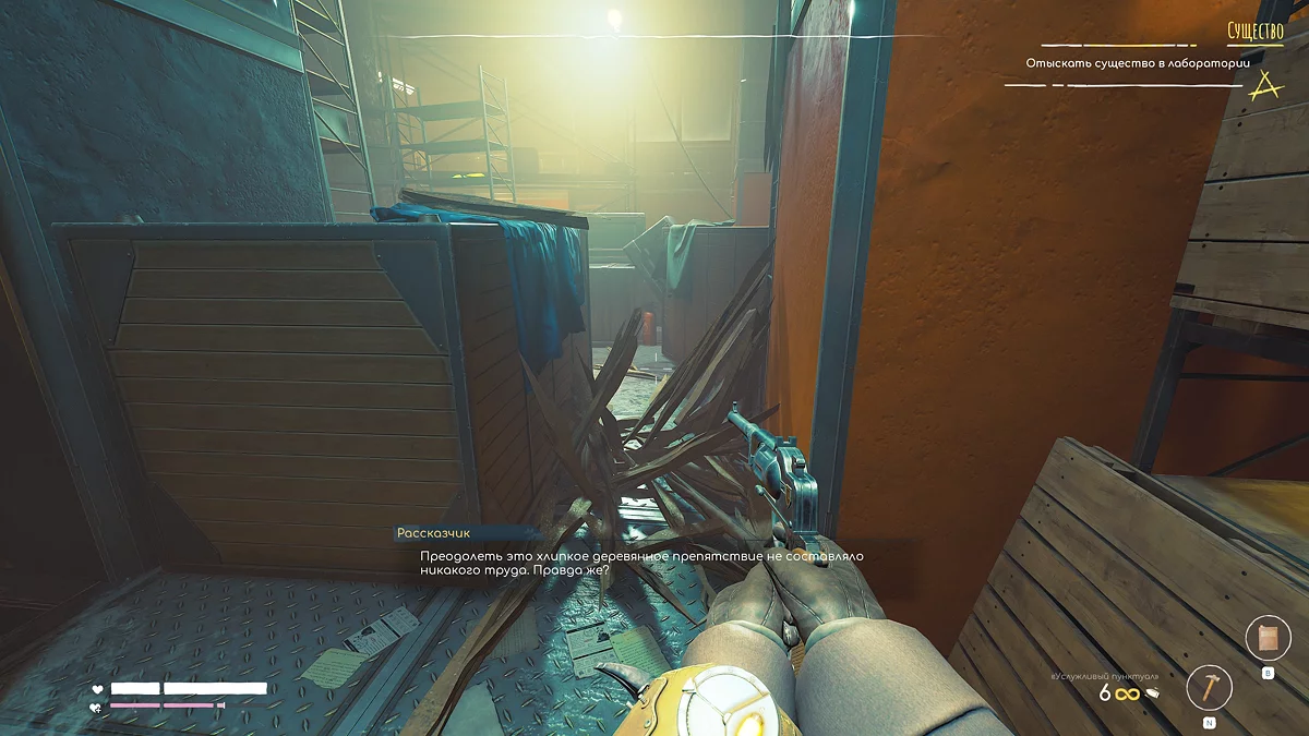 После слов рассказчика пройдите в коридор спереди и пройдите в складское помещение, сломав перед этим доски в проходе.