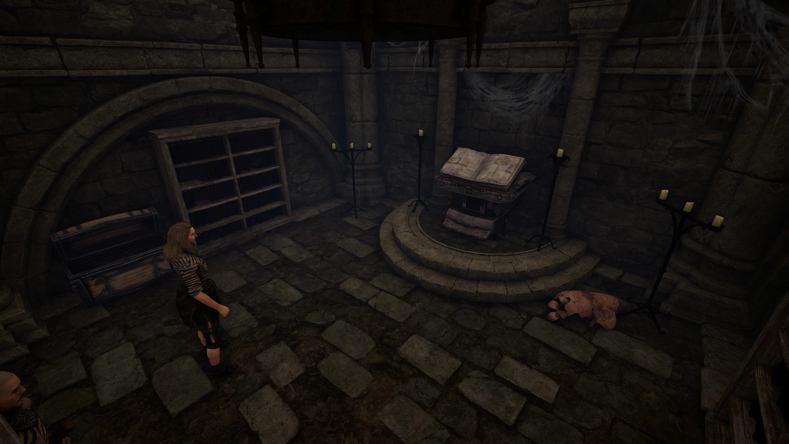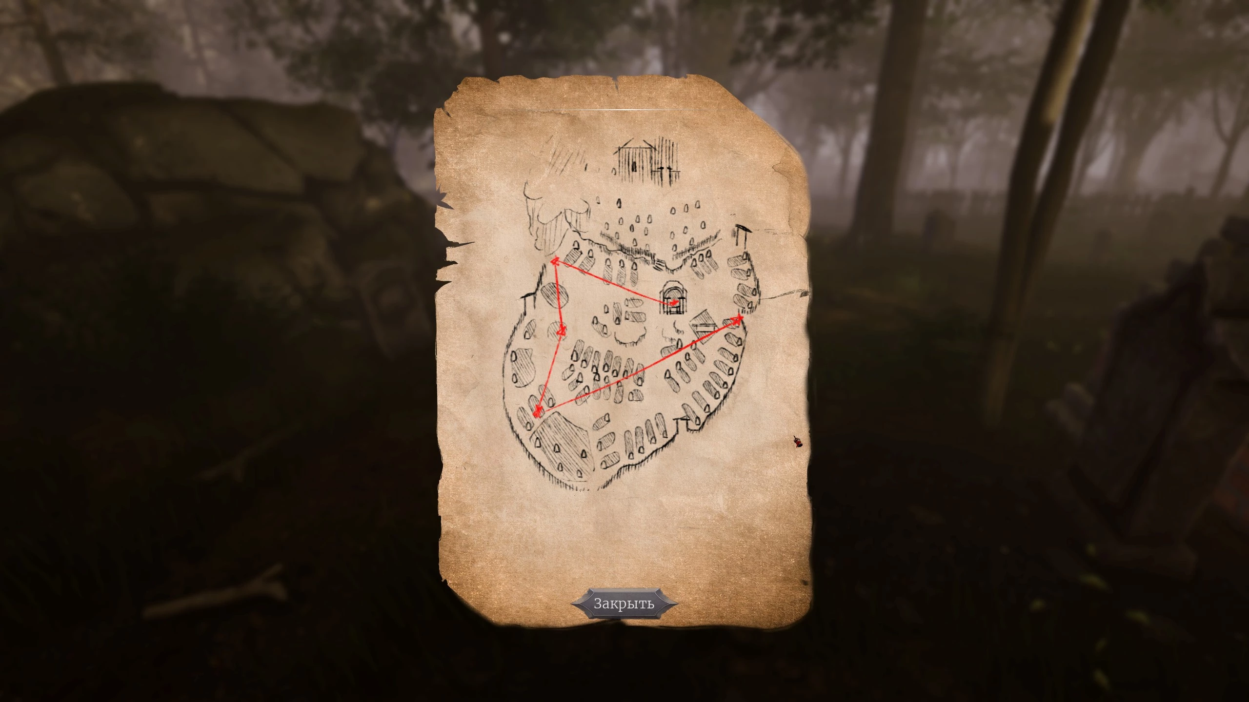 По всему кладбищу разбросано пять зажигающихся свечей, а в часовне лежит записка с подсказкой. Нужно зажечь их по порядку, так же, как изображено на схеме. Затем следует опустить рычаг в углу церкви. В результате откроется решетка в подвал с книгой.