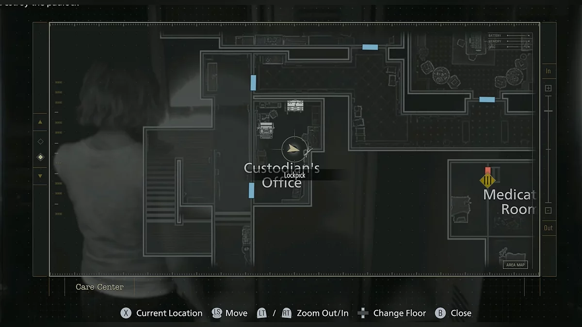 После получения браслета с доступом первого уровня, вам откроется ординаторская (Custodian's Office) недалеко от кухни западного крыла. Изучите шкафчик в дальнем левом углу офиса, чтобы получить вторую отмычку.