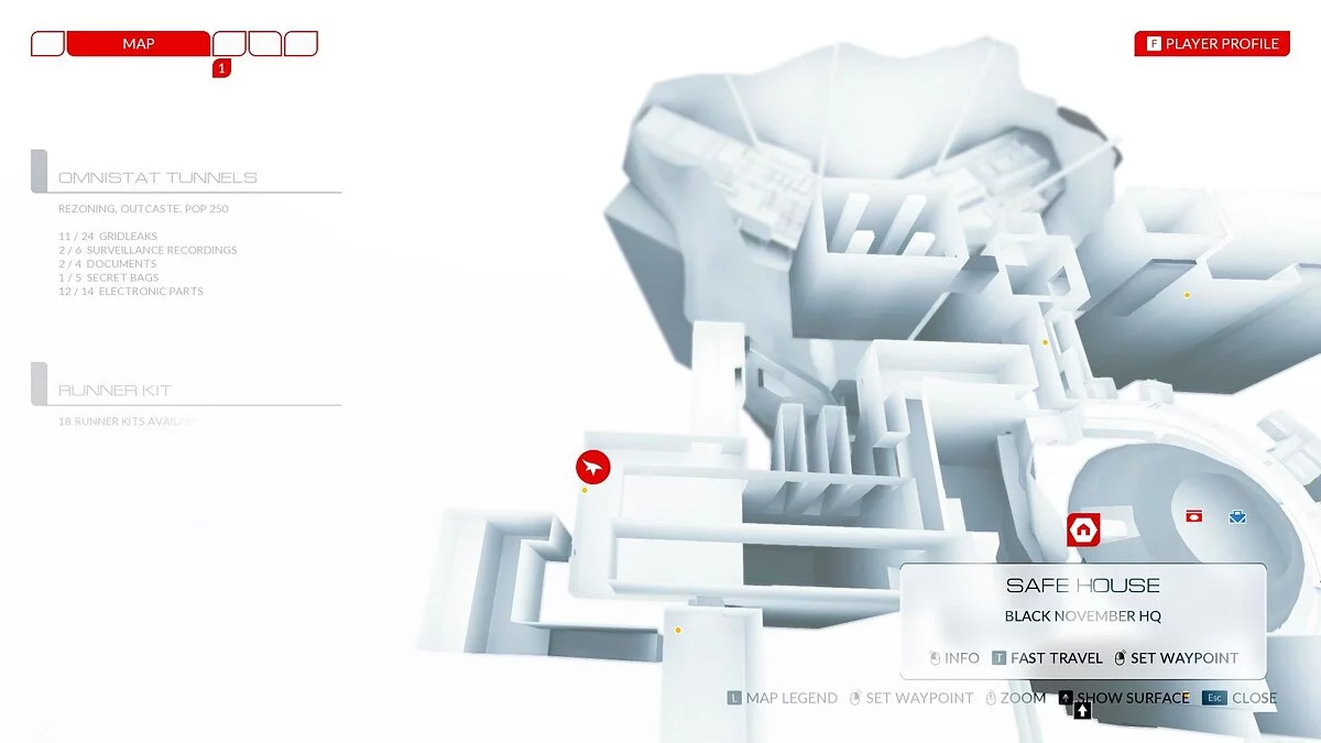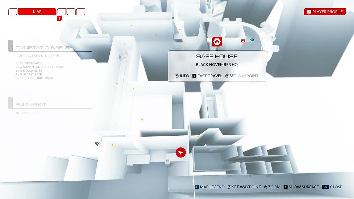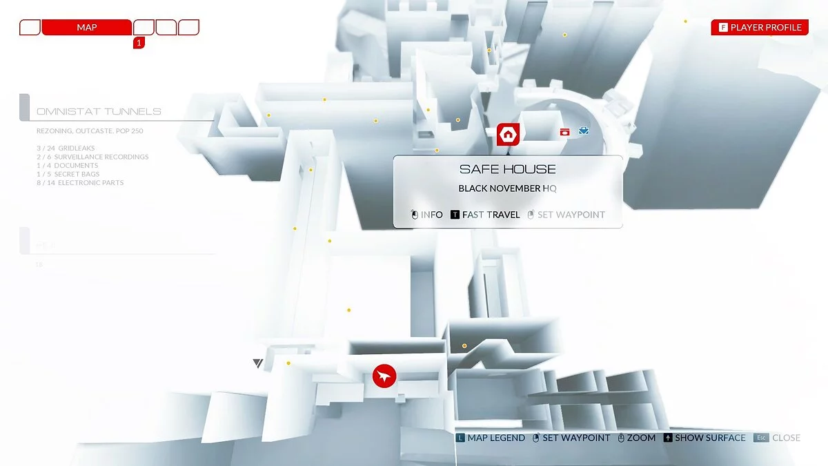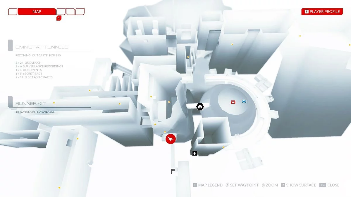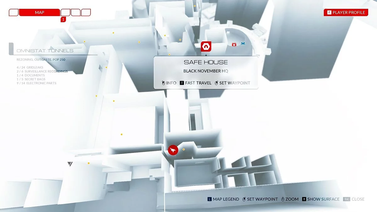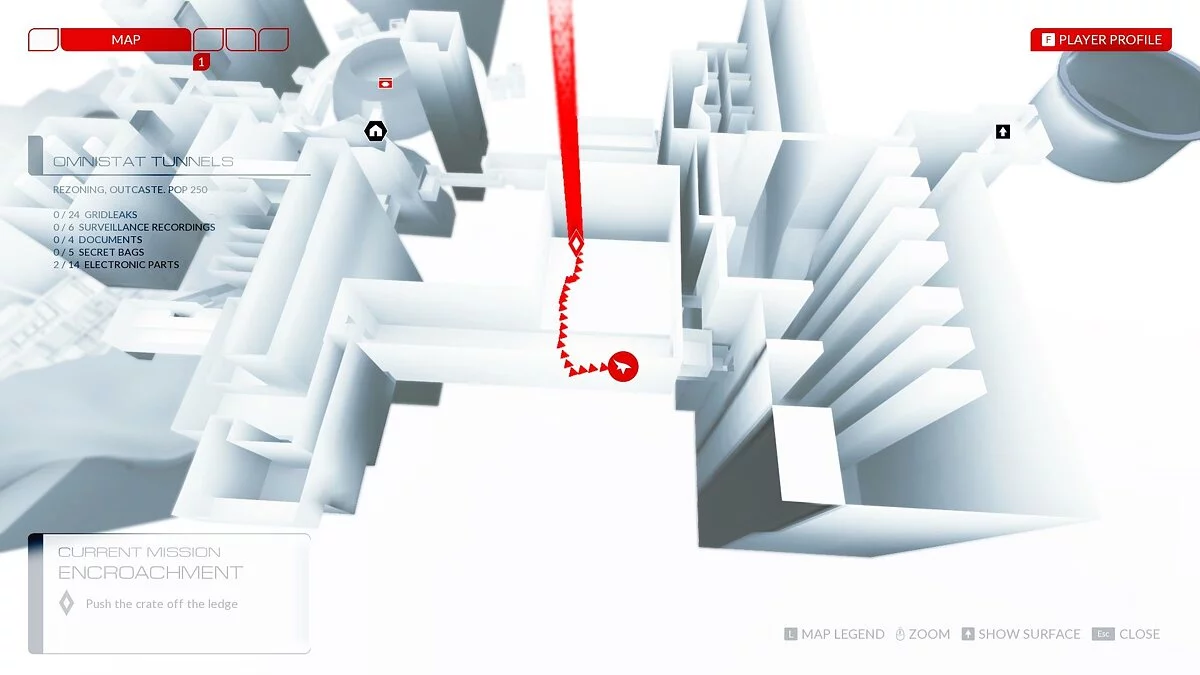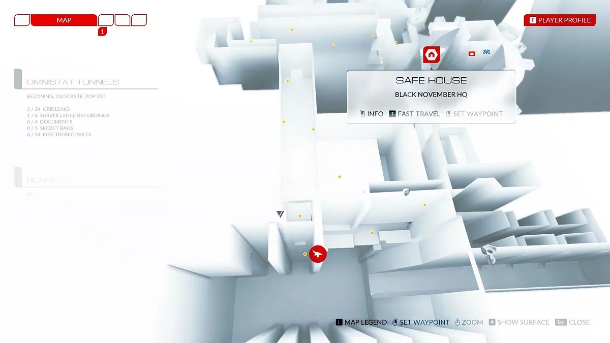 Имейте в виду, что некоторые документы, аудиозаписи и секретные сумки можно собрать, только внутри определенной сюжетной миссии. Вы можете проверить количество собираемых предметов в каждой миссии, открыв вкладку ЗАДАНИЕ в меню Mirror's Edge Catalyst. Не волнуйтесь, если что-то пропустите, так как каждую миссию можно перепройти, собрав все нужные для 100-процентного прохождения компоненты.