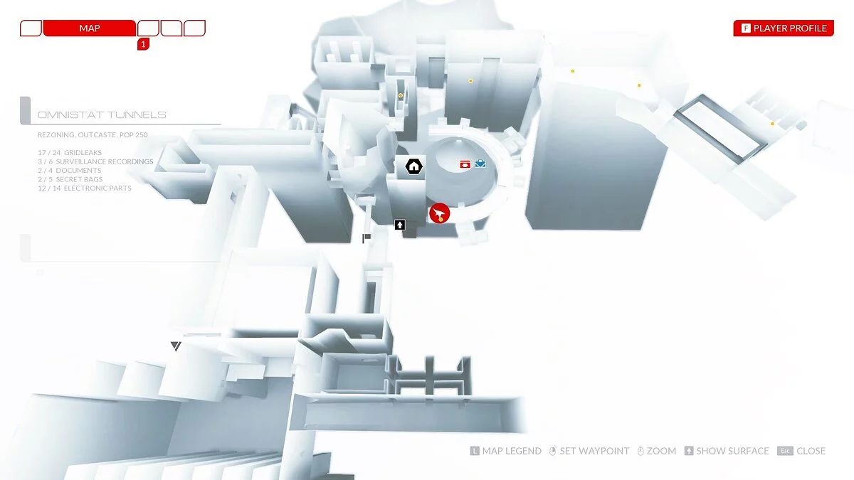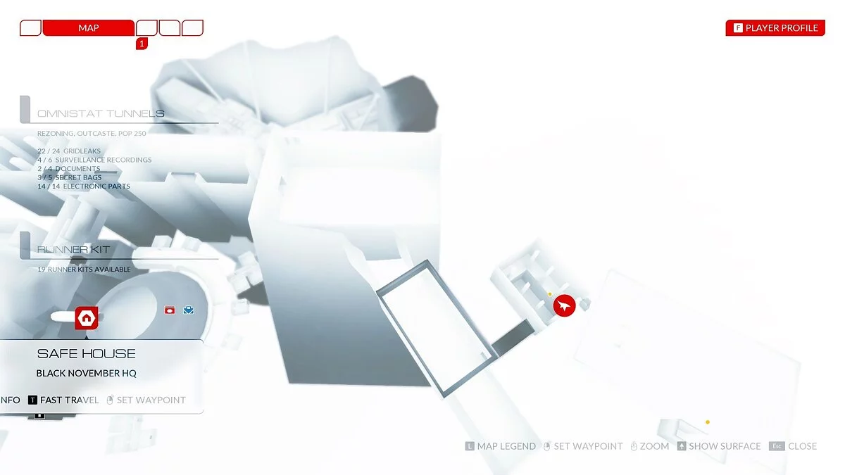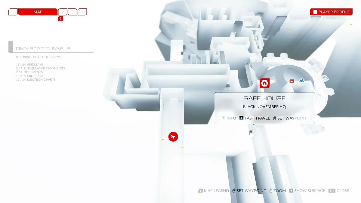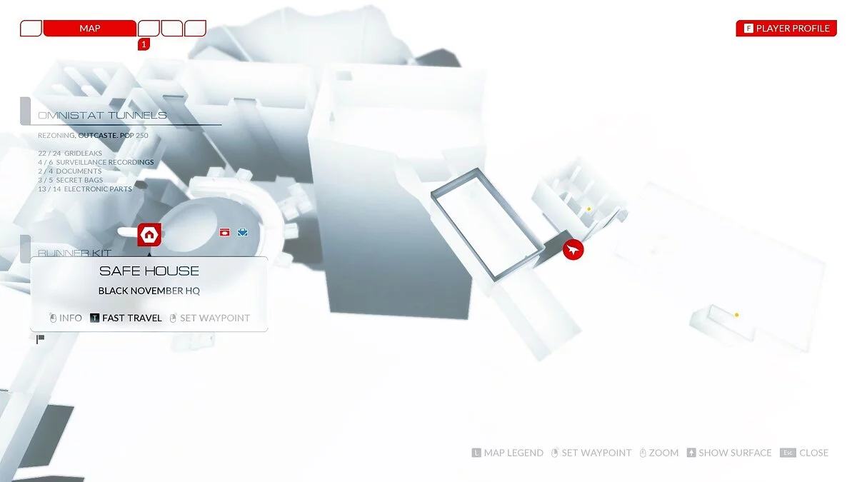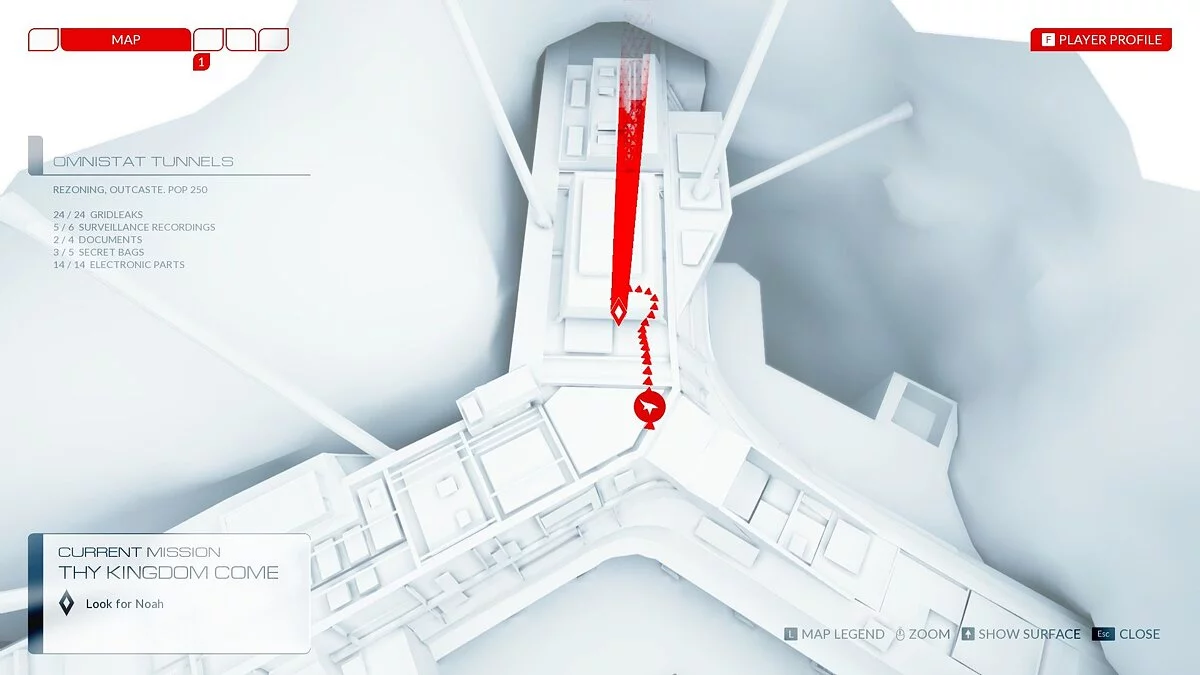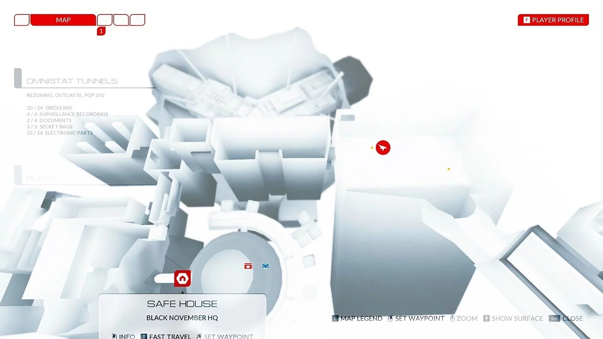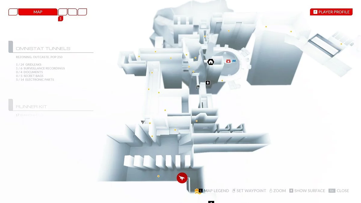 Имейте в виду, что некоторые документы, аудиозаписи и секретные сумки можно собрать, только внутри определенной сюжетной миссии. Вы можете проверить количество собираемых предметов в каждой миссии, открыв вкладку ЗАДАНИЕ в меню Mirror's Edge Catalyst. Не волнуйтесь, если что-то пропустите, так как каждую миссию можно перепройти, собрав все нужные для 100-процентного прохождения компоненты.