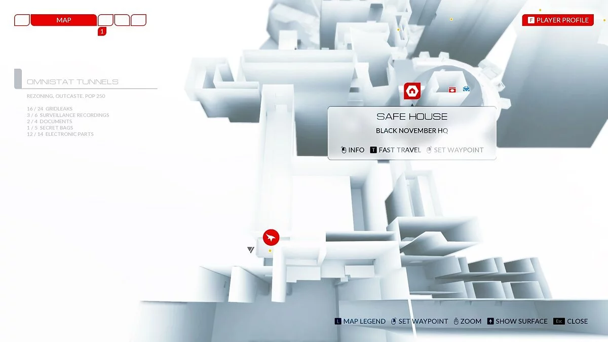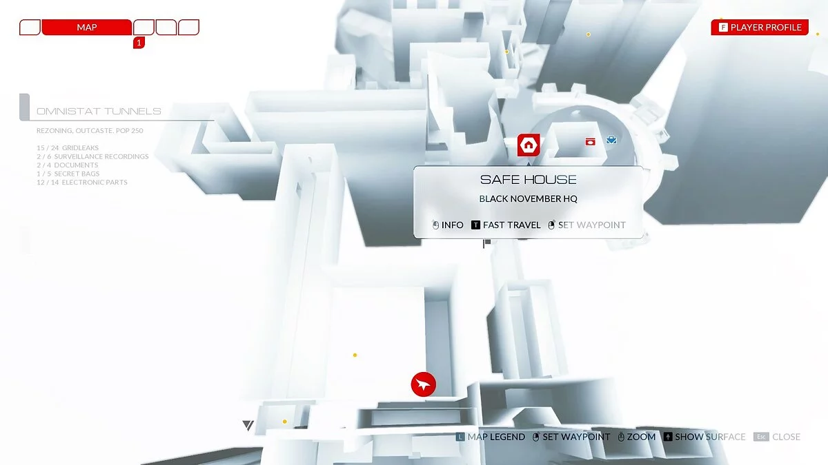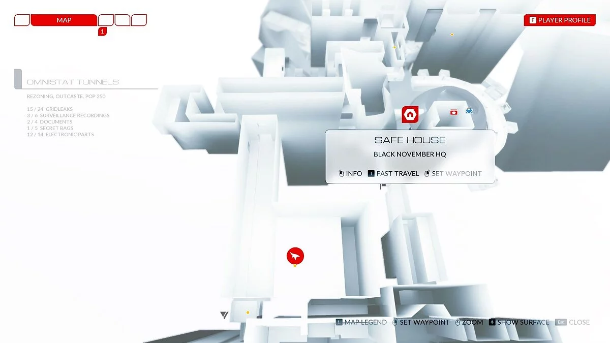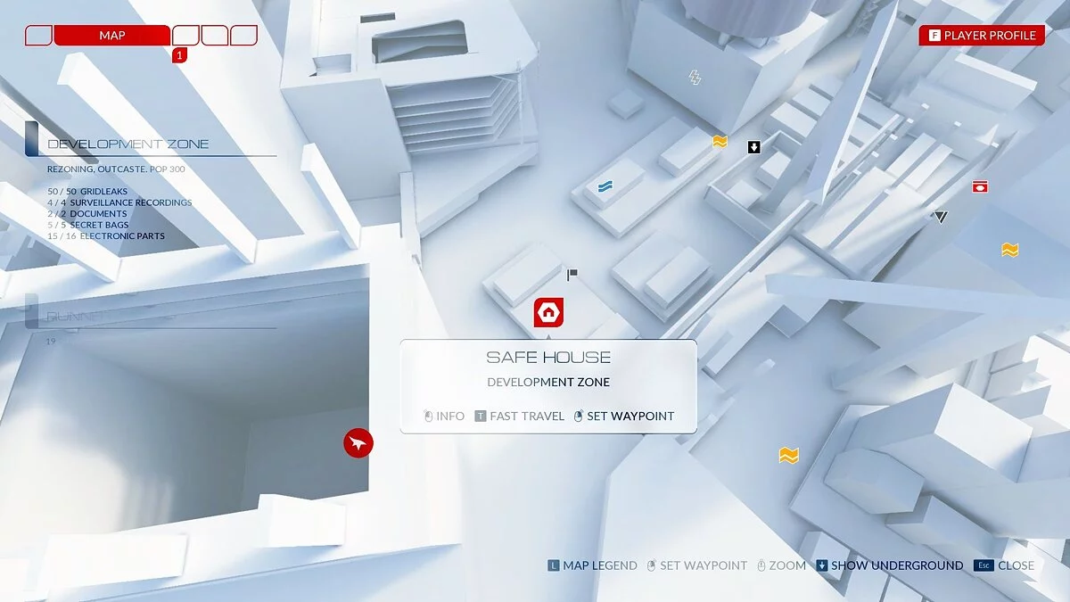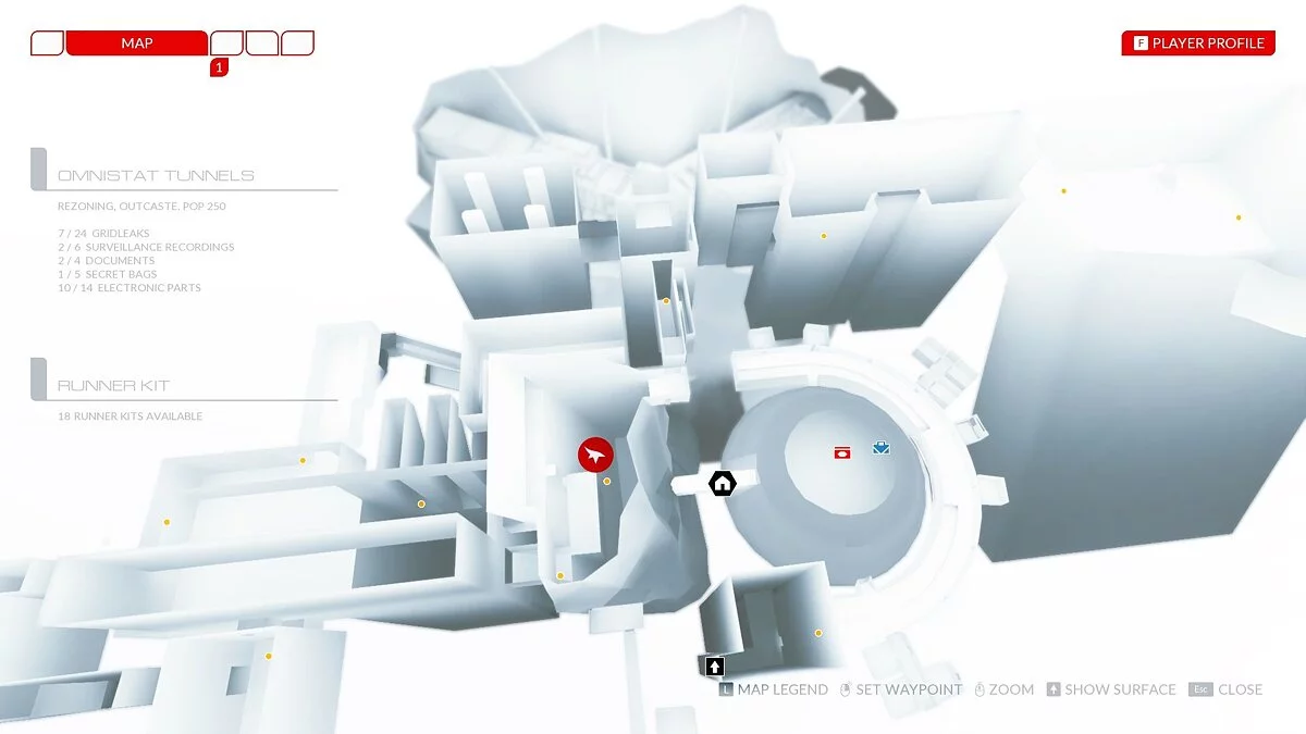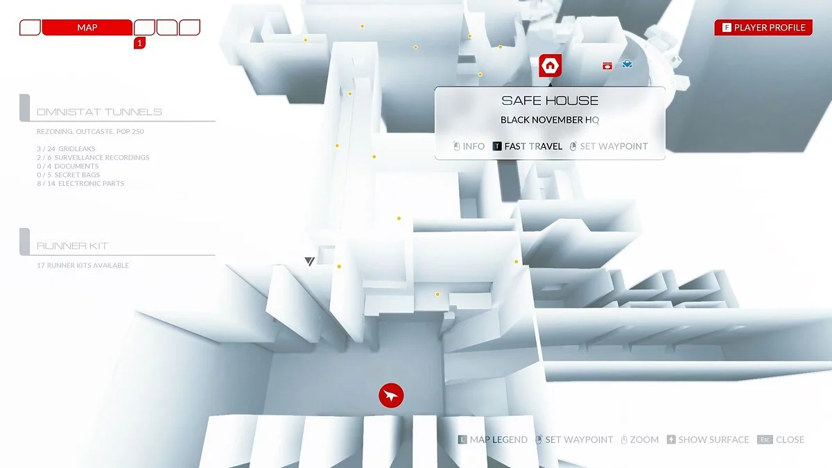Имейте в виду, что некоторые документы, аудиозаписи и секретные сумки можно собрать, только внутри определенной сюжетной миссии. Вы можете проверить количество собираемых предметов в каждой миссии, открыв вкладку ЗАДАНИЕ в меню Mirror's Edge Catalyst. Не волнуйтесь, если что-то пропустите, так как каждую миссию можно перепройти, собрав все нужные для 100-процентного прохождения компоненты.
