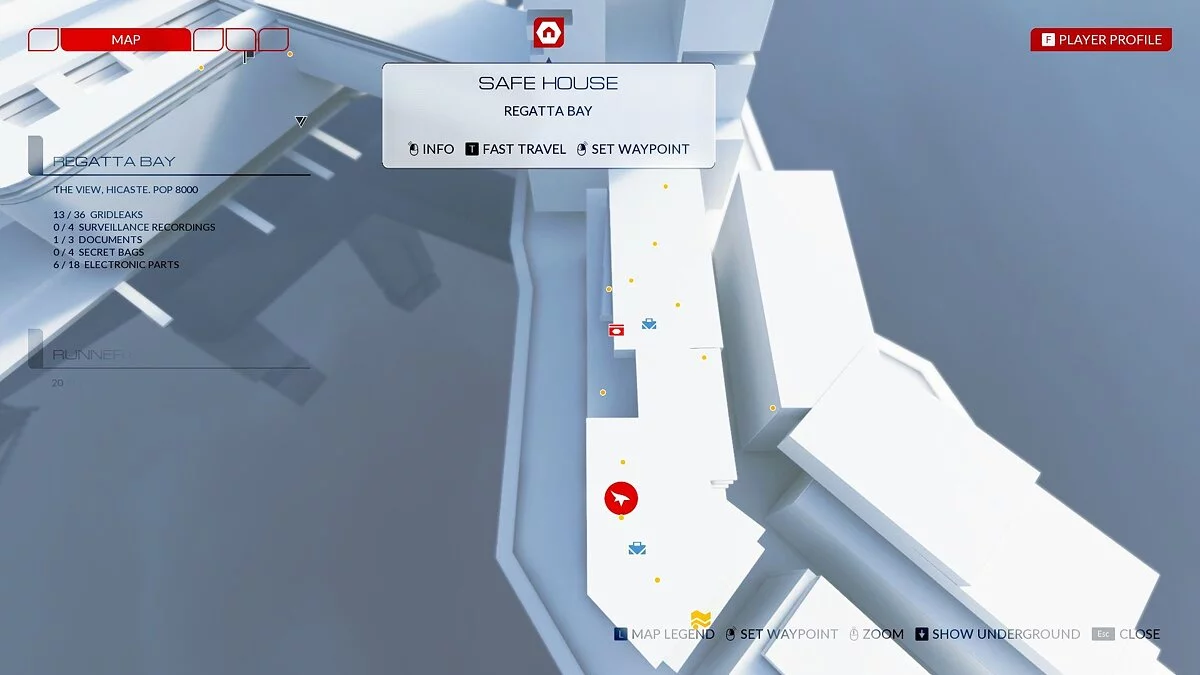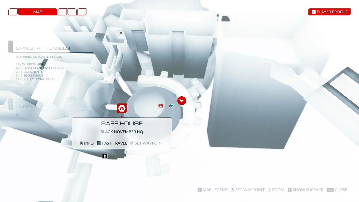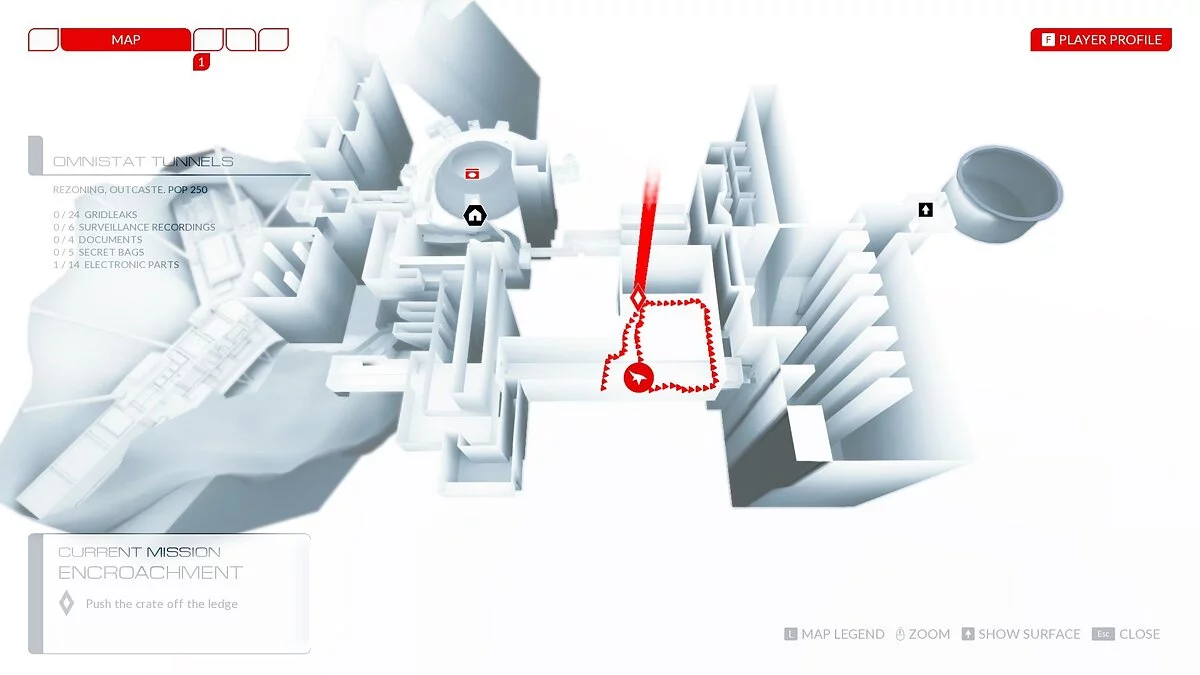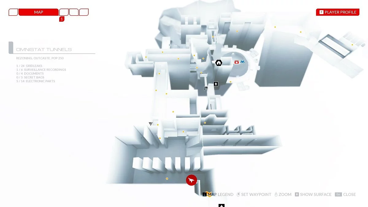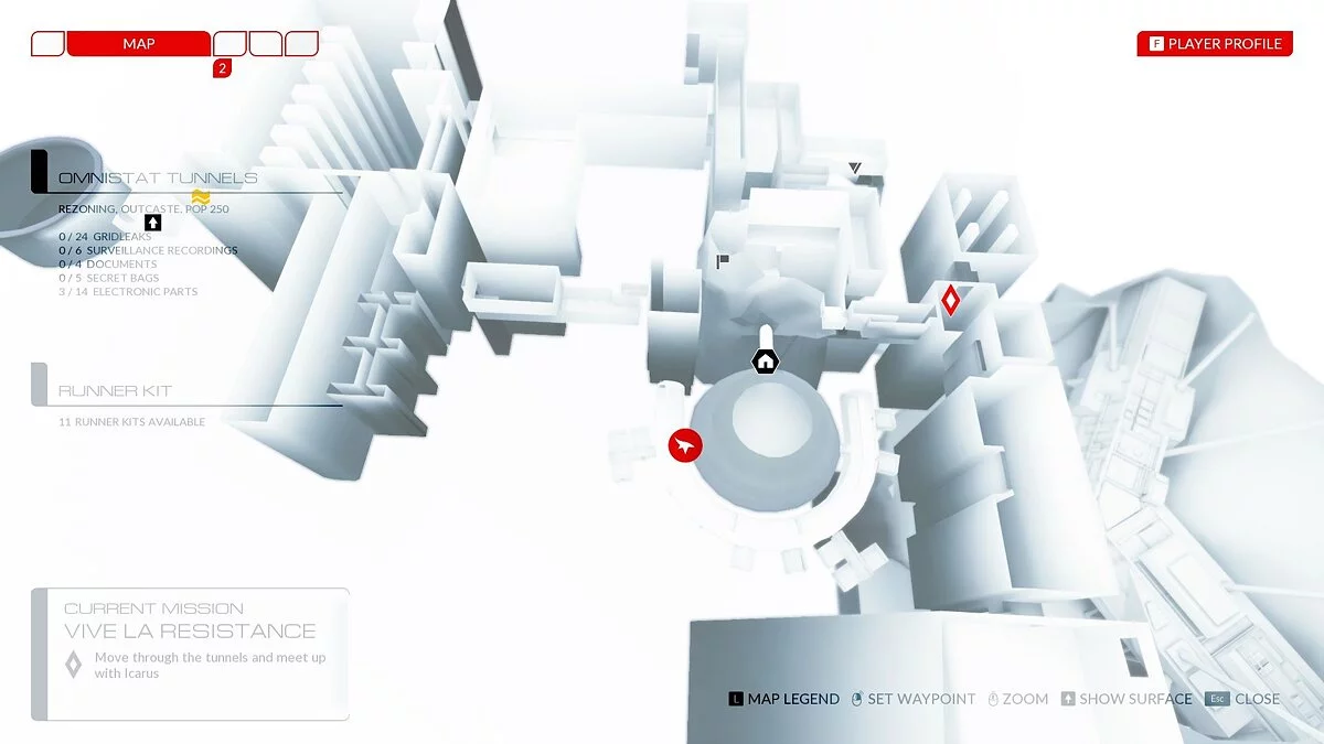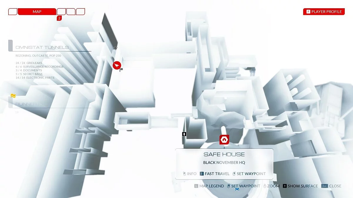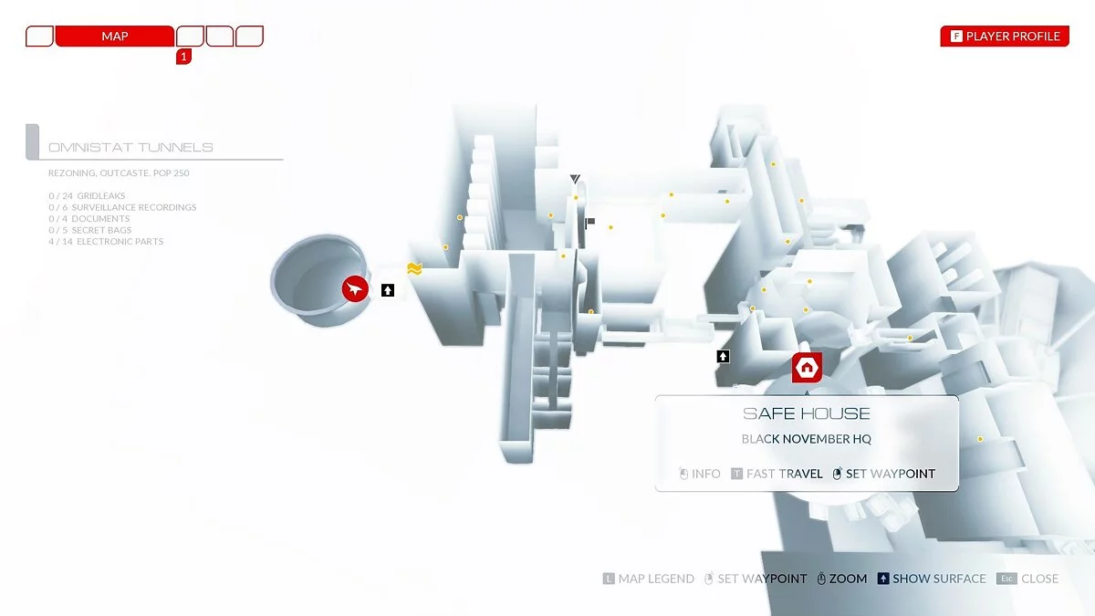 Имейте в виду, что некоторые документы, аудиозаписи и секретные сумки можно собрать, только внутри определенной сюжетной миссии. Вы можете проверить количество собираемых предметов в каждой миссии, открыв вкладку ЗАДАНИЕ в меню Mirror's Edge Catalyst. Не волнуйтесь, если что-то пропустите, так как каждую миссию можно перепройти, собрав все нужные для 100-процентного прохождения компоненты.